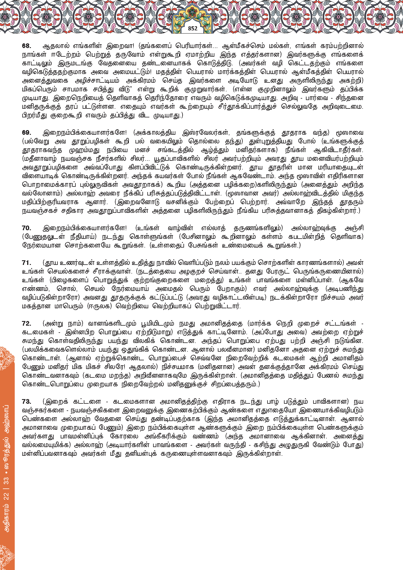 73. Akibatnya Allah akan menyeksa lelaki yang munafik serta wanita yang munafik, dan lelaki yang musyrik serta wanita yang musyrik dan juga Allah akan menerima taubat lelaki yang beriman serta wanita yang beriman. Sememangnya Allah Maha Pengampun, lagi Maha Penyayang.