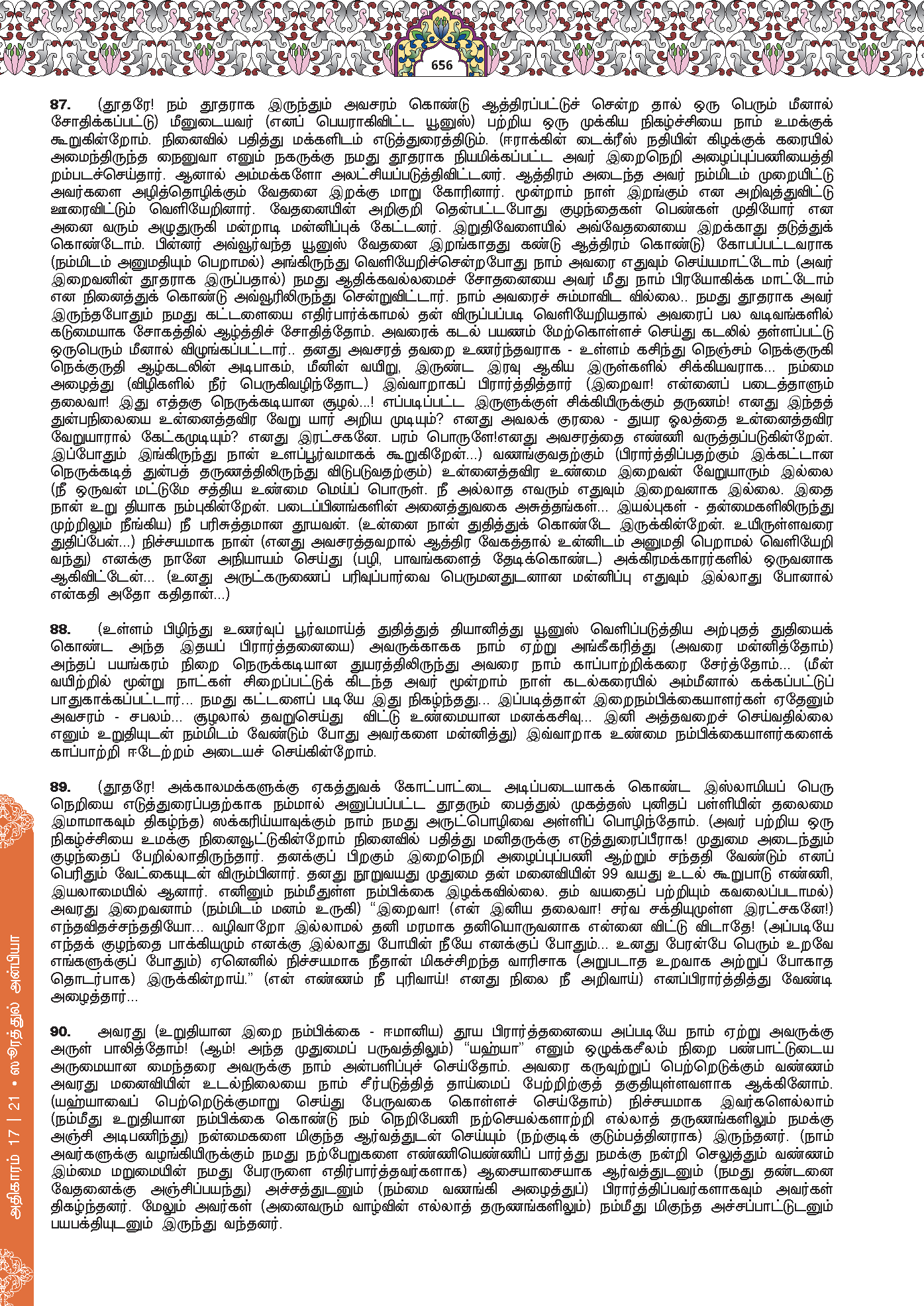 87. Dan (sebutkanlah peristiwa) Zu al-Nun (Nabi Yunus), ketika dia pergi (meninggalkan kaumnya) dalam keadaan marah, yang menyebabkan dia menyangka bahawa Kami tidak akan mengenakannya kesusahan atau cubaan. (Setelah dia ditelan ikan paus) maka, dia pun menyeru dalam keadaan yang gelap-gelita dengan berkata, “Sesungguhnya tiada Tuhan (yang dapat menolong) melainkan Engkau (ya Allah)! Maha Suci Engkau, sesungguhnya aku adalah daripada orang yang menganiaya diri sendiri.”