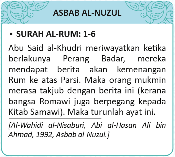 3. Di negeri yang terdekat (dengan Parsi iaitu Syam dan Palestin) dan mereka (bangsa Rom) selepas kekalahan itu akan menang (ke atas bangsa Parsi).