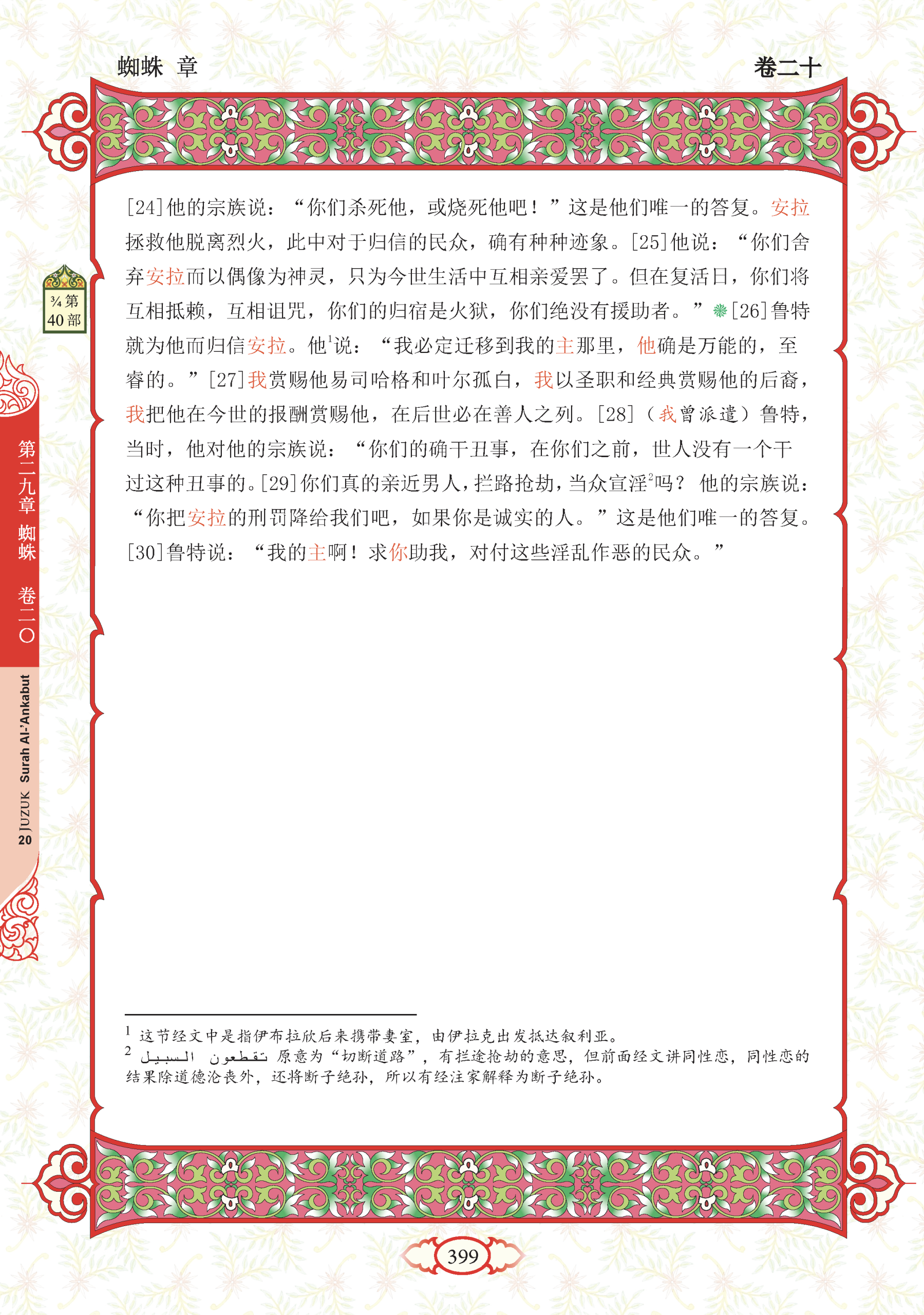 29. “Patutkah kamu mendatangi (melakukan hubungan jenis dengan) orang lelaki (untuk memuaskan nafsu kamu), menyamun dan mengerjakan kemungkaran di tempat-tempat perhimpunan kamu?” Maka kaumnya tidak menjawab selain daripada berkata (secara mempersendakan), “Datangkanlah kepada kami azab daripada Allah jika betul engkau daripada orang yang benar.”