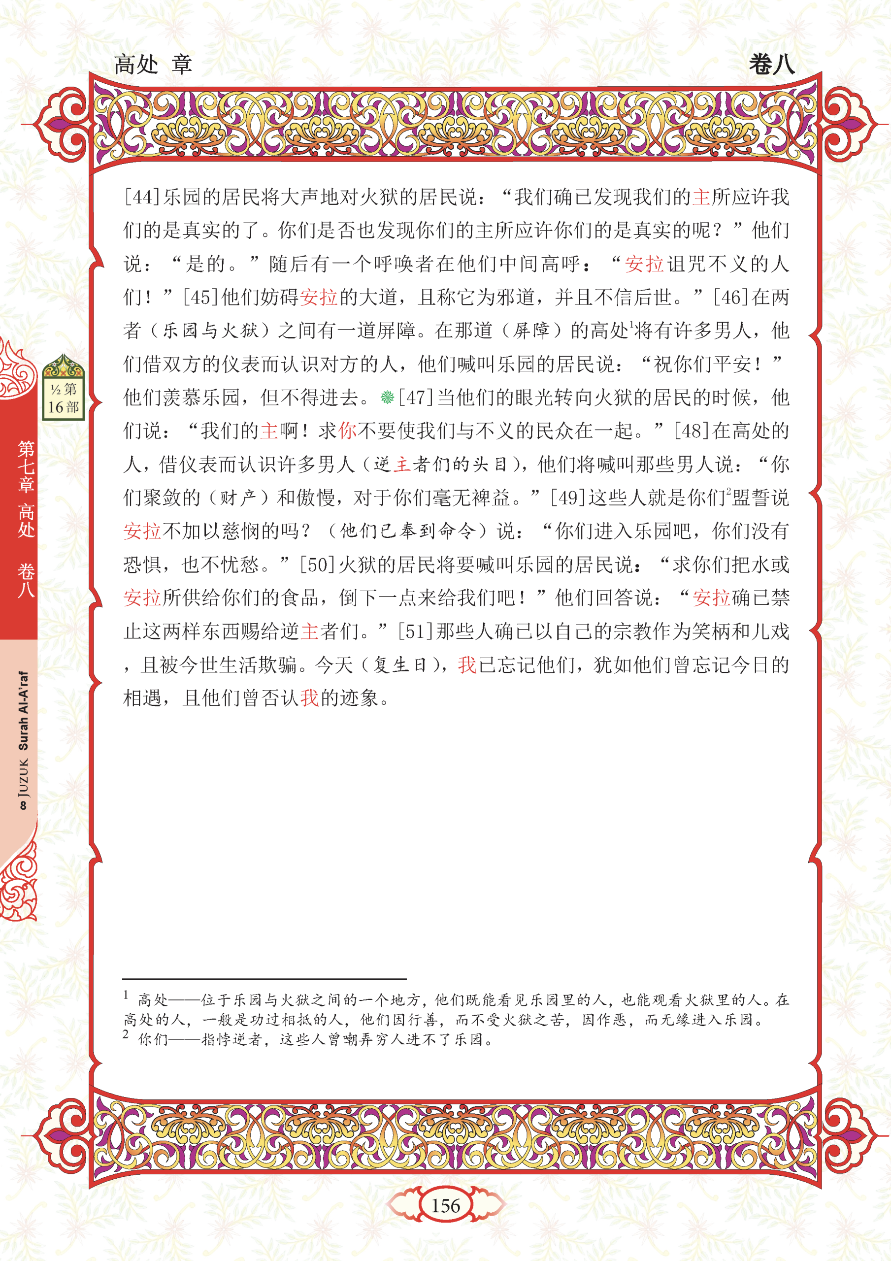 50. Dan (Tuhan menerangkan pula kehinaan ahli neraka dengan firman-Nya), “Ahli neraka menyeru ahli syurga (dengan berkata), ‘Limpahkanlah kepada kami sedikit daripada air atau daripada rezeki (makanan) yang telah dikurniakan Allah kepada kamu.’ Mereka (ahli syurga) menjawab, ‘Sesungguhnya Allah telah mengharamkan kedua-duanya terhadap orang kafir’.”