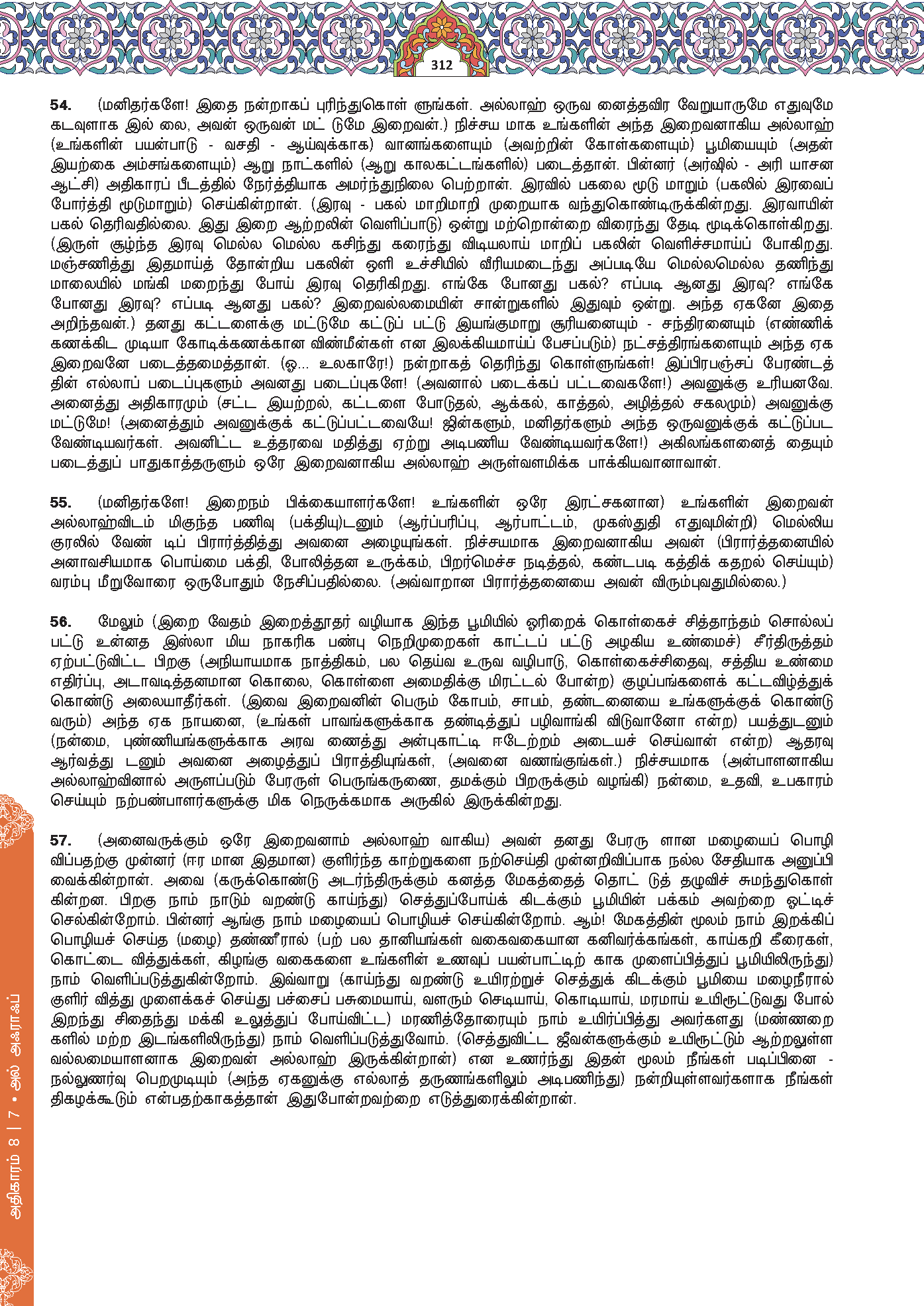 57. Dia-lah (Allah) yang menghantarkan angin sebagai pembawa berita yang menggembirakan sebelum kedatangan rahmat-Nya (iaitu hujan), hingga apabila angin itu membawa awan mendung, Kami halakannya ke negeri yang mati (ke daerah yang kering-kontang), lalu Kami turunkan hujan dengan awan itu, kemudian Kami keluarkan dengan air hujan itu berbagai-bagai jenis buah-buahan. Demikianlah pula Kami mengeluarkan (menghidupkan semula) orang yang telah mati, supaya kamu beringat (mengambil pengajaran daripadanya).