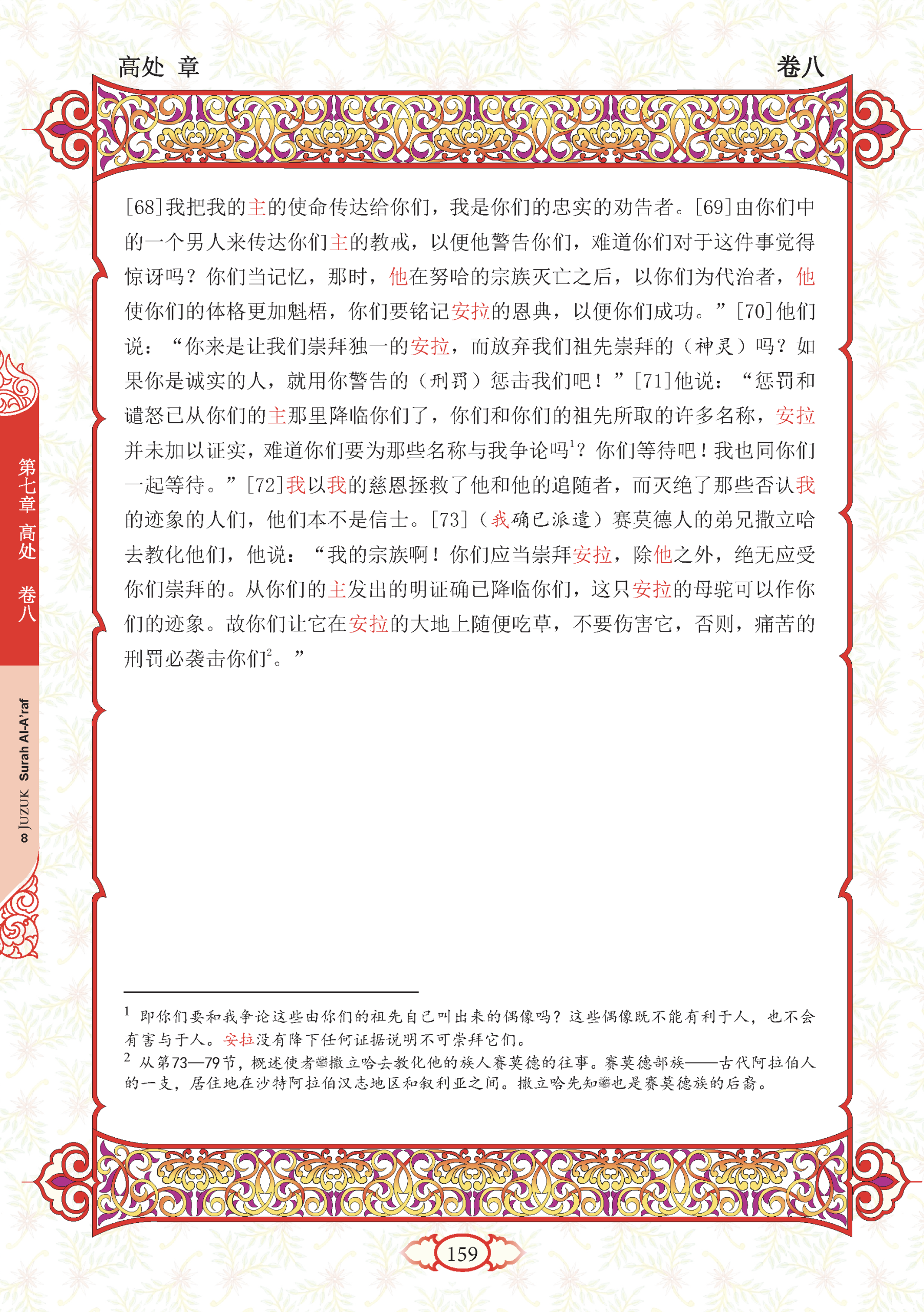 73. And to Thamud (We sent) their brother Salih. He said: “O my people! Worship Allah, you have no god but Him. Surely clear proof from your Lord has come to you. This she-camel is Allah’s, (and) a sign to you, leave