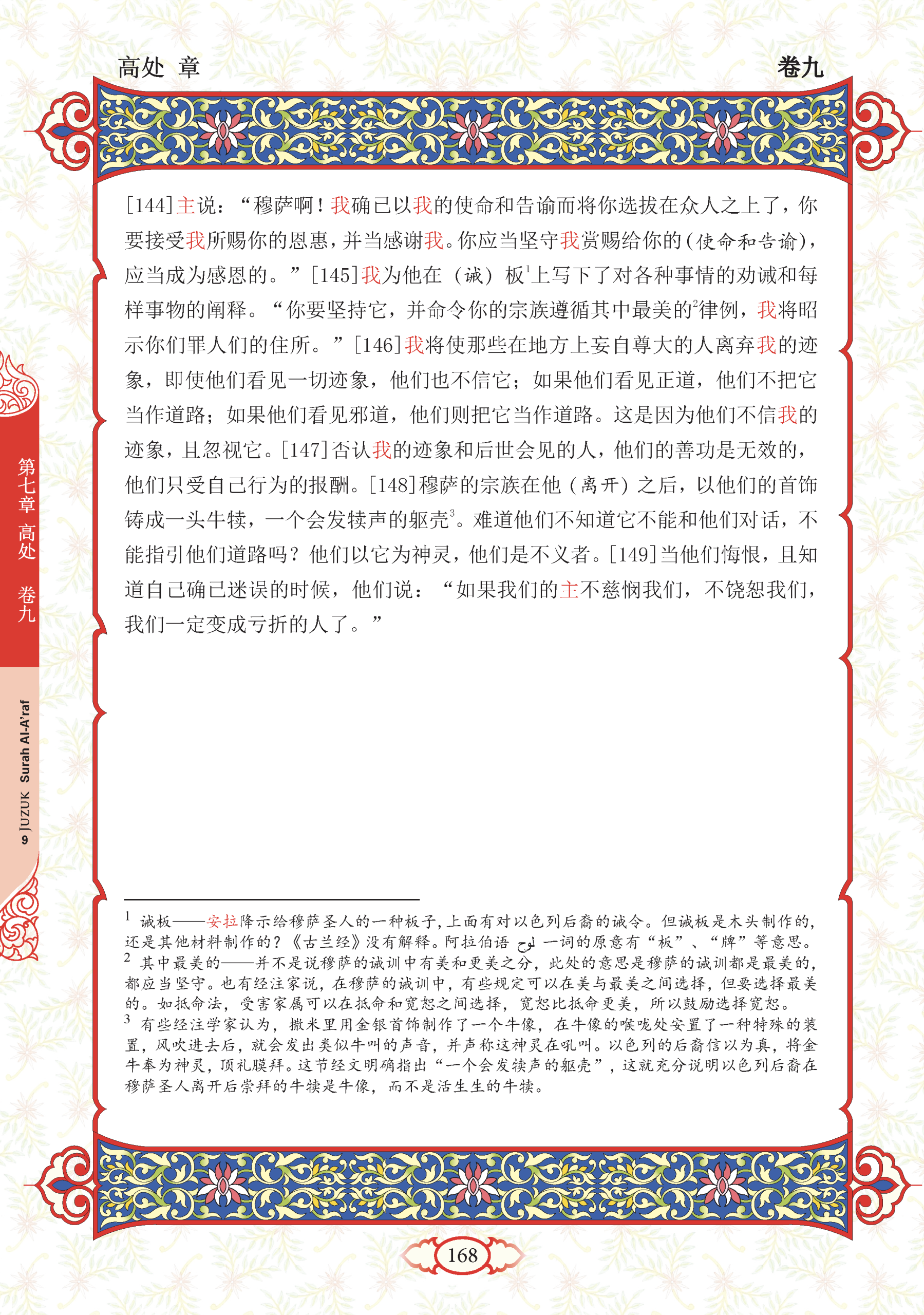 148. Dan sesudah keberangkatan (Nabi) Musa (ke Gunung Tursina), kaum (Nabi Musa) membuat daripada barang-barang perhiasan mereka, patung anak lembu yang bertubuh dan bersuara (yang didengari). (Allah berfirman), “Apakah mereka tidak memikirkan bahawa patung itu tidak dapat berkata-kata dengan mereka dan tidak dapat juga menunjukkan jalan kepada mereka? Mereka menjadikannya (berhala yang disembah), dan sememangnya mereka adalah orang yang melakukan kezaliman.”