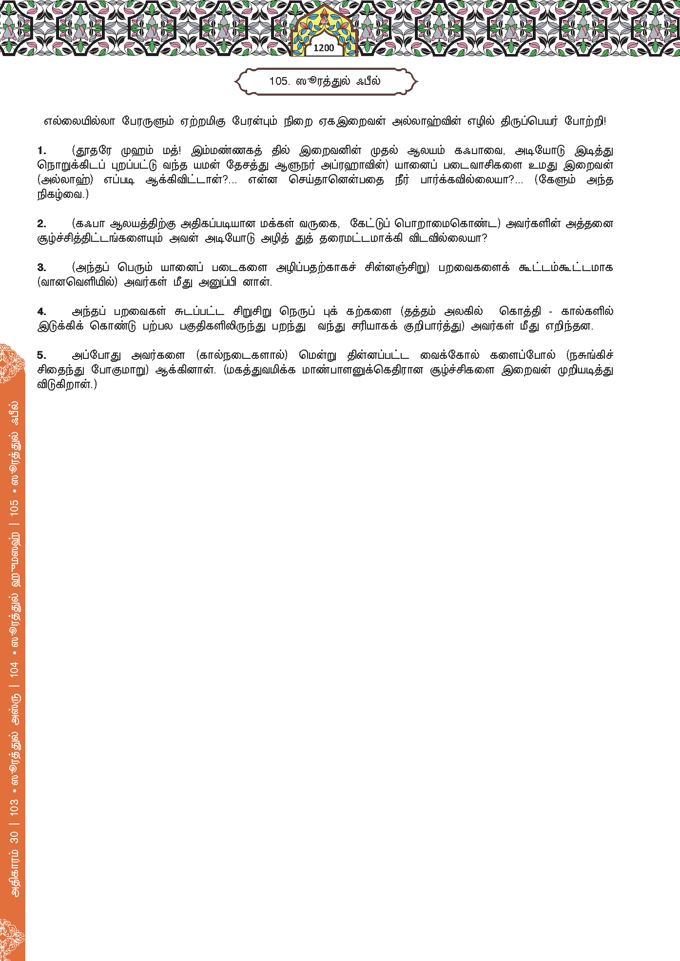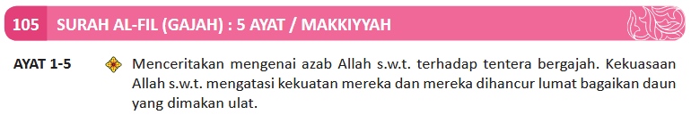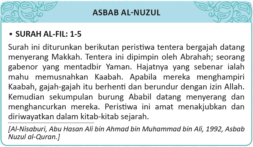 1. Tidakkah engkau perhatikan bagaimana Tuhanmu telah melakukan kepada angkatan tentera bergajah (yang hendak meruntuhkan Kaabah)?