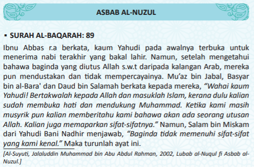 89. Dan ketika datang kepada mereka sebuah Kitab daripada Allah (al-Quran), yang mengesahkan apa yang ada pada mereka (Kitab Taurat), padahal sebelumnya mereka itu sentiasa memohon pertolongan (kepada Allah agar beroleh kemenangan) ke atas kaum kafir musyrik (dengan mengucapkan: Ya Allah, tolonglah kami dengan seorang nabi yang akan dibangkitkan pada akhir zaman). Tetapi setelah datang kepada mereka apa yang mereka sedia mengetahui kebenarannya (Nabi Muhammad dan al-Quran), mereka mengingkarinya. Maka (dengan yang demikian), laknat Allah menimpa orang yang kafir (ingkar) itu.