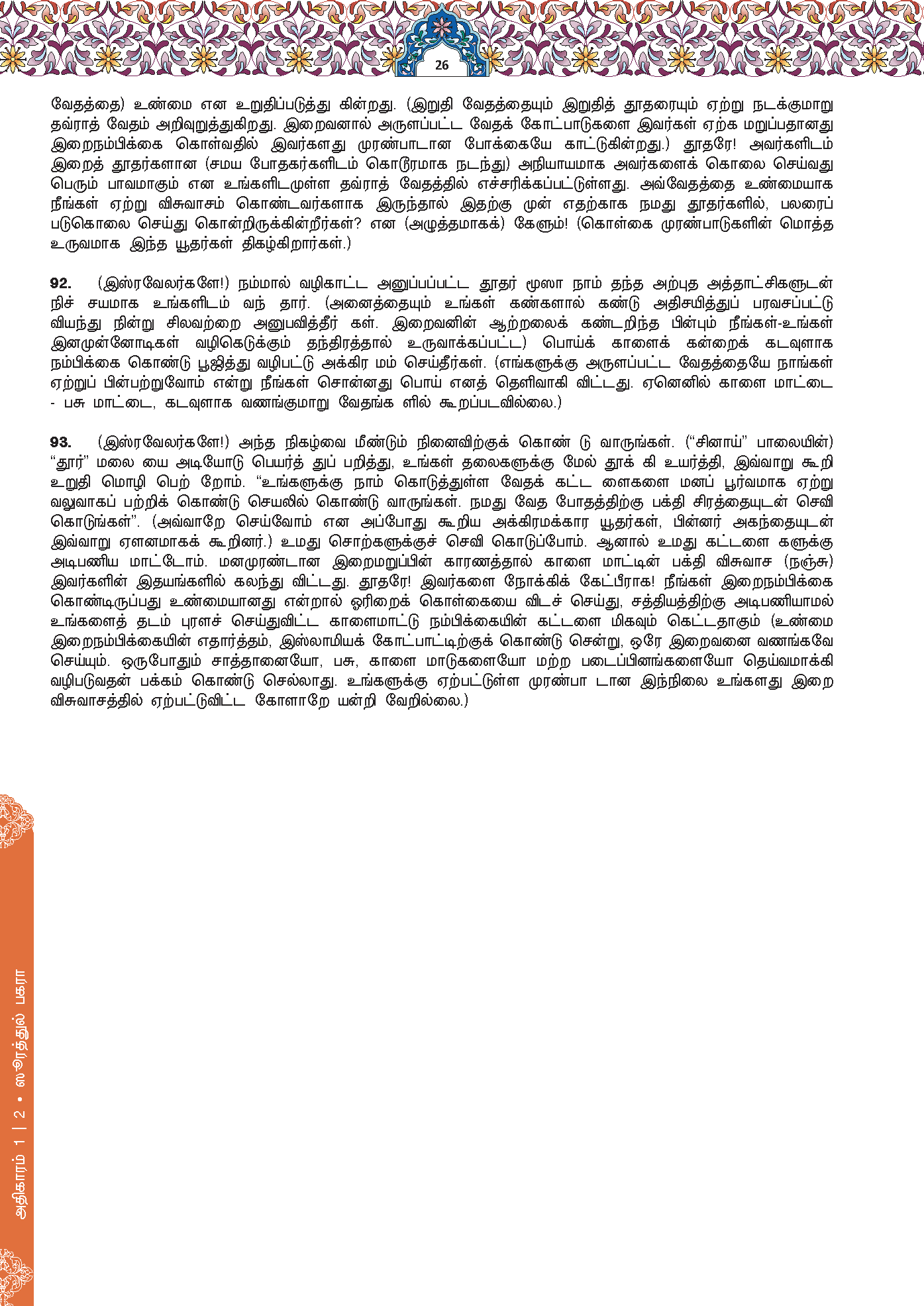 93. Dan (ingatlah) ketika Kami mengikat perjanjian setia dengan kamu semasa Kami angkatkan Bukit Tursina itu di atas kamu (sambil Kami berfirman), “Berpegang teguhlah (dan amalkanlah ajaran Kitab Taurat) yang Kami berikan kepada kamu itu dengan bersungguh-sungguh, dan dengarlah (apa yang diperintahkan kepada kamu dengan mematuhinya)”. Mereka menjawab, “Kami dengar tetapi kami tidak mahu mematuhinya.” Sedangkan kegemaran menyembah (patung) anak lembu itu telah meresap dan sebati dalam hati mereka, dengan sebab kekufuran mereka. Katakanlah (wahai Muhammad), “Amatlah jahat apa yang disuruh oleh iman kamu itu kalaulah kamu orang yang beriman.”