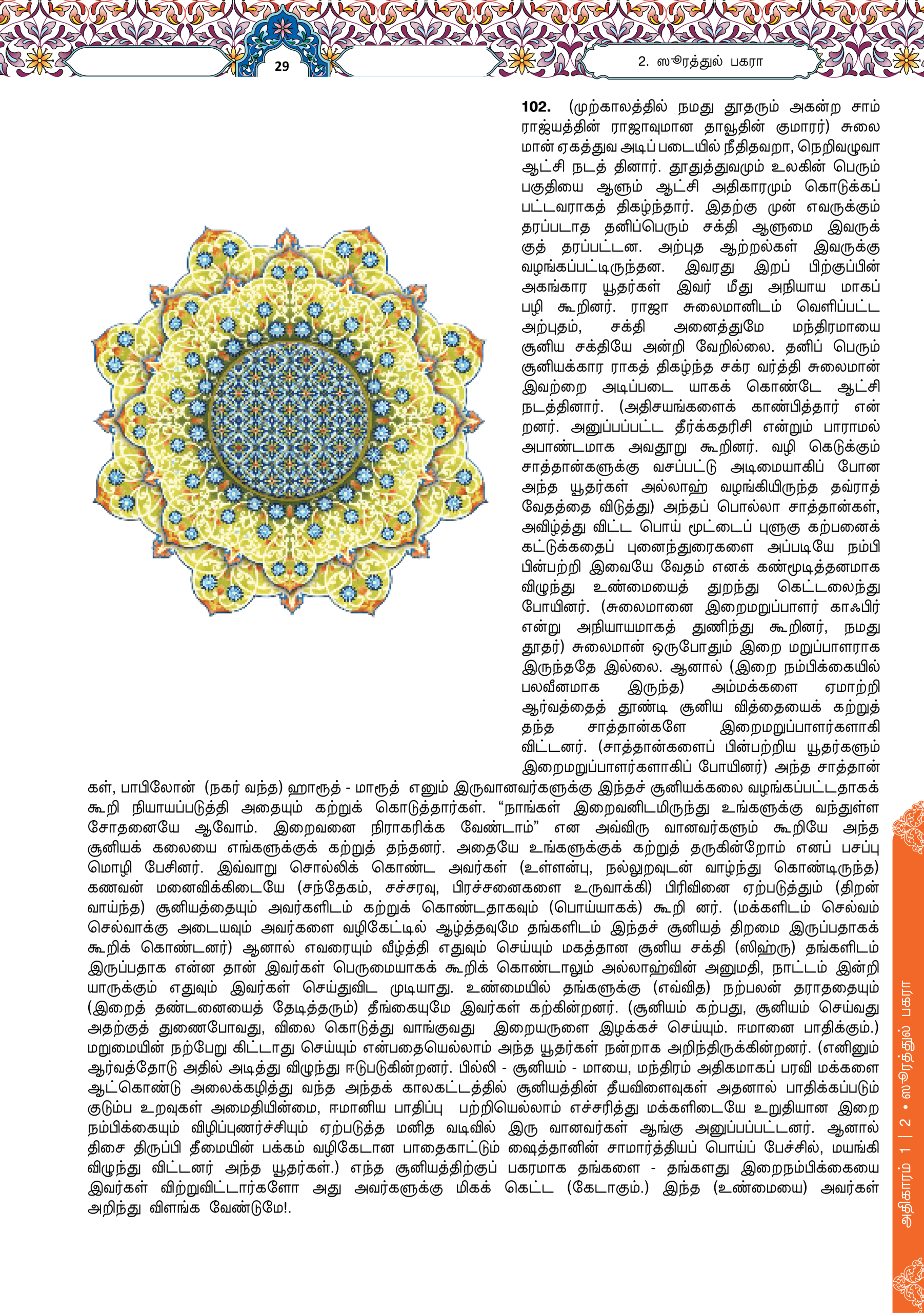 102. Dan mereka mengikuti ajaran-ajaran sihir yang dibacakan oleh puak-puak syaitan dalam masa pemerintahan (Nabi) Sulaiman, padahal (Nabi) Sulaiman tidaklah kafir (tidak mengamalkan sihir yang menyebabkan kekufuran itu), akan tetapi puak-puak syaitan itulah yang kafir (dengan amalan sihir itu), kerana merekalah yang mengajarkan manusia ilmu sihir dan apa yang diturunkan kepada dua malaikat, Harut dan Marut, di negeri Babil (Babylon), sedangkan mereka berdua tidak mengajar seseorang pun melainkan setelah mereka menasihatinya dengan berkata, “Sesungguhnya kami ini hanyalah cubaan (untuk menguji imanmu), oleh itu janganlah engkau menjadi kafir (dengan mempelajarinya)”. Dalam pada itu ada juga orang yang mempelajari daripada mereka berdua ilmu sihir yang boleh menceraikan antara seorang suami dengan isterinya, padahal mereka tidak akan dapat sama sekali memberi mudarat (atau membahayakan) dengan sihir itu terhadap seseorang pun melainkan dengan izin Allah. Sebenarnya mereka mempelajari perkara yang hanya membahayakan mereka (di akhirat) dan tidak memberi manfaat kepada mereka. Sesungguhnya mereka (kaum Yahudi itu) telah pun mengetahui bahawa sesiapa yang memilih ilmu sihir itu, dia tidak akan mendapat bahagian yang baik di akhirat dan amatlah buruk apa yang mereka pilih untuk diri mereka, kalaulah mereka mengetahui.