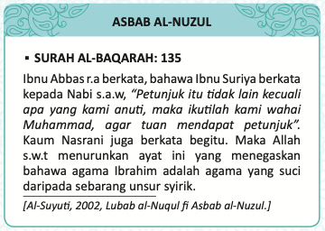 135. Dan mereka (kaum Yahudi dan Nasrani) berkata, “Jadilah kamu sebagai pemeluk agama Yahudi atau pemeluk agama Nasrani, nescaya kamu akan mendapat petunjuk.” Katakanlah (wahai Muhammad), “Tidak, bahkan kami akan mengikut agama Nabi Ibrahim yang lurus (di atas dasar tauhid), dan bukanlah dia daripada orang musyrik.”