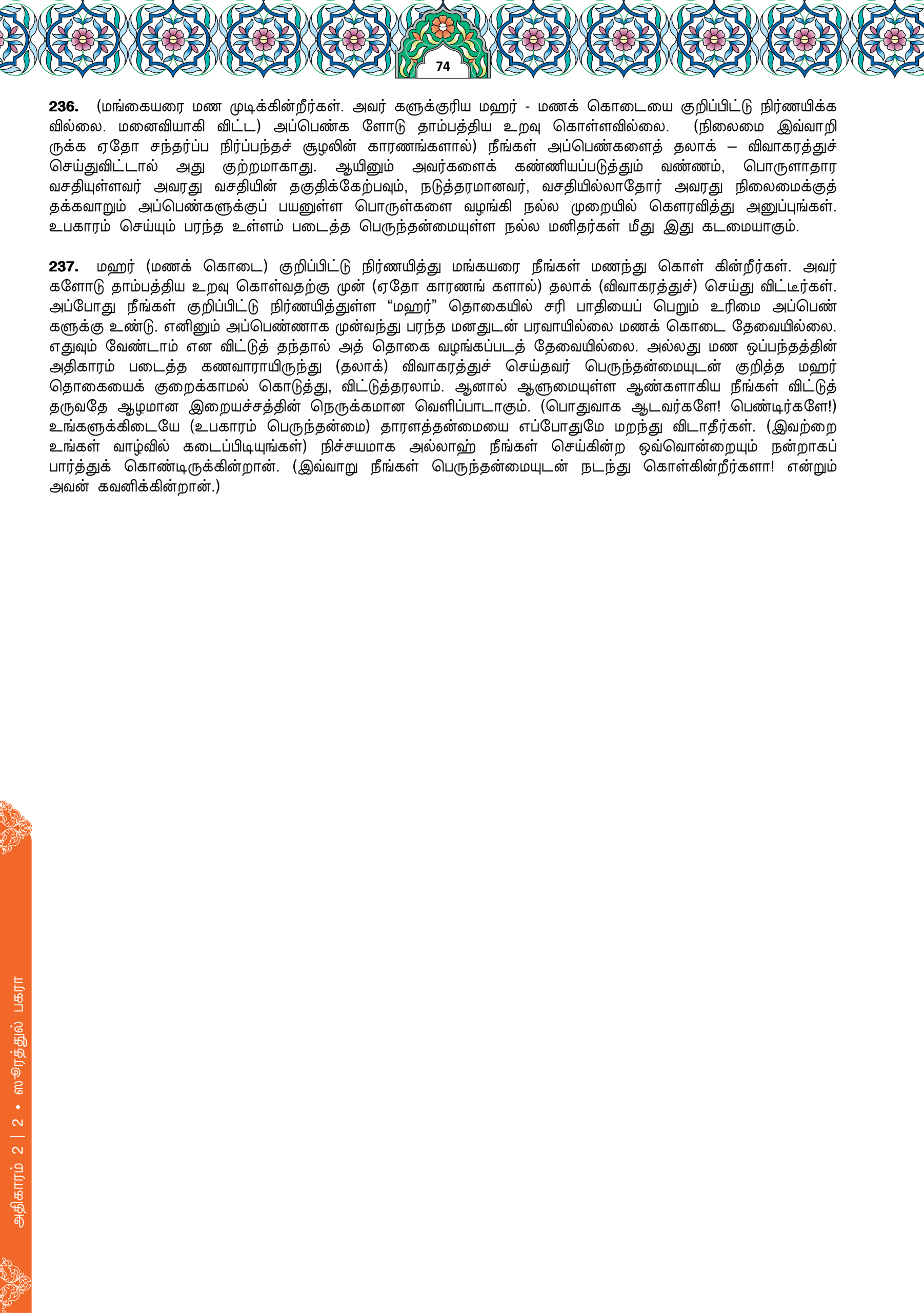 236. Tidaklah ada kewajipan membayar mas kahwin atas kamu, jika kamu menceraikan isteri-isteri kamu sebelum kamu sentuh (bercampur) dengan mereka atau (sebelum) kamu menetapkan mas kahwin untuk mereka. Walaupun demikian, hendaklah kamu memberi mutaah (pemberian sagu hati) kepada mereka (yang diceraikan itu). Iaitu, suami yang senang (hendaklah memberi sagu hati itu) menurut ukuran kemampuannya, dan suami yang susah pula menurut ukuran kemampuannya, sebagai pemberian sagu hati menurut yang patut (menurut syarak), yang demikian merupakan ketentuan bagi orang yang berbuat kebaikan.