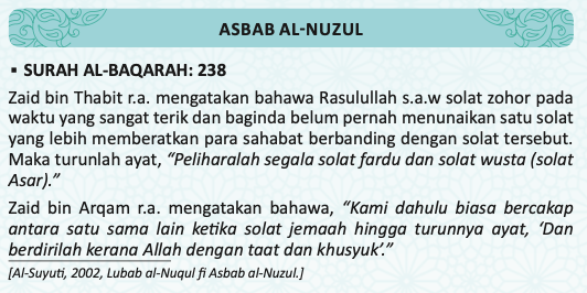 238. Peliharalah segala solat fardhu, dan (peliharalah) solat wusta (solat asar), dan laksanakanlah kerana Allah (dalam solat kamu) dengan taat dan khusyuk.