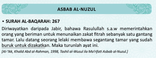 267. Wahai orang yang beriman! Nafkahkanlah (pada jalan Allah) sebahagian daripada hasil usaha kamu yang baik-baik, dan sebahagian daripada apa yang Kami keluarkan dari bumi untuk kamu (biji-bijian dan buah-buahan). Janganlah kamu sengaja memilih yang buruk daripadanya lalu kamu dermakan (atau kamu jadikan pemberian zakat), padahal kamu sendiri tidak sekali-kali akan mengambil yang buruk itu (kalau diberikan kepada kamu), kecuali dengan memejamkan mata padanya. Ketahuilah, sesungguhnya Allah Maha Kaya lagi Maha Terpuji.