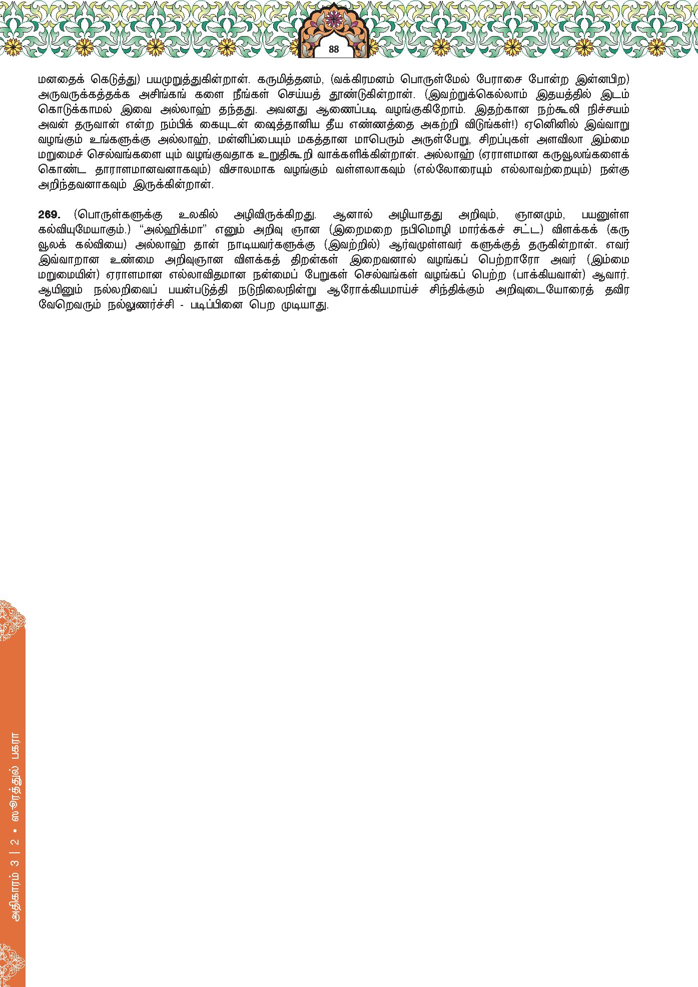269. Allah memberikan hikmah (kebijaksanaan atau ilmu yang berguna) kepada sesiapa yang Dia kehendaki (menurut aturan yang ditentukan-Nya). Sesiapa yang diberikan hikmah itu, maka sesungguhnya dia telah diberikan kebaikan yang banyak. Hanya orang yang berakal sahaja dapat mengambil pengajaran.
