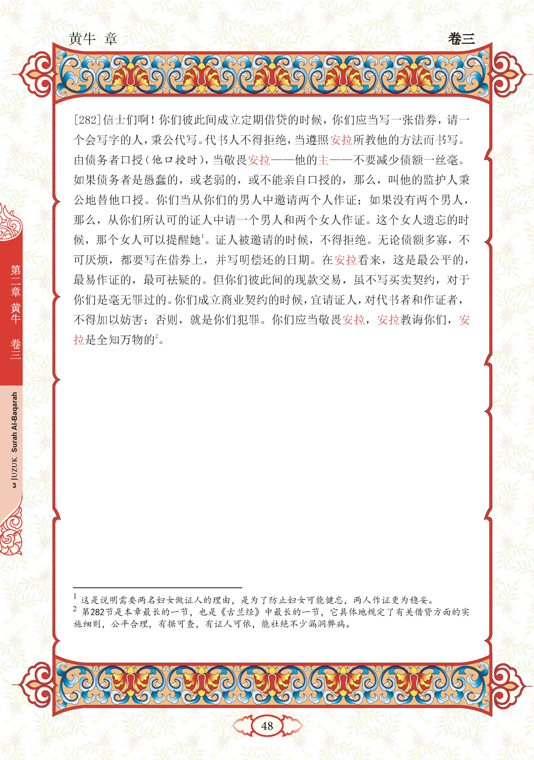 282. Wahai orang yang beriman! Apabila kamu menjalankan sesuatu urusan hutang piutang yang diberi tempoh sehingga ke suatu masa tertentu, maka hendaklah kamu mencatat (hutang dan masa bayarannya itu); dan hendaklah seorang penulis antara kamu menulisnya dengan adil (benar), dan janganlah seseorang penulis enggan menulis sebagaimana Allah telah mengajarkannya. Maka, hendaklah dia menulis dan hendaklah orang yang berhutang itu merencanakan (isi surat hutang itu dengan jelas), serta hendaklah dia bertakwa kepada Allah, Tuhannya, dan janganlah dia mengurangkan sesuatu pun daripada hutang itu. Sekiranya orang yang berhutang itu kurang cerdik atau lemah (keadaannya kerana terlalu muda atau tua) atau dia sendiri tidak dapat hendak merencanakan (isi surat itu disebabkan bisu atau gagap), maka hendaklah walinya merencanakannya (isi surat hutang itu) dengan adil (jujur), dan hendaklah mengadakan penyaksian hutang itu dengan dua orang saksi lelaki daripada kalangan kamu. Sekiranya tidak ada dua orang saksi lelaki, maka seorang lelaki dan dua orang perempuan (boleh menjadi saksi) daripada saksi-saksi yang kamu sukai (disebabkan agama dan kejujurannya), supaya jika yang seorang lupa daripada saksi-saksi perempuan yang berdua itu maka seorang lagi dapat mengingatkannya, dan janganlah saksi-saksi itu menolak apabila mereka dipanggil menjadi saksi serta janganlah kamu jemu menulis urusan hutang yang bertempoh masanya itu, sama ada kecil atau besar jumlahnya. Yang demikian itu (catatan-catatan hutang itu), lebih adil di sisi Allah dan lebih menguatkan keterangan saksi, dan juga lebih kecil kemungkinan yang boleh menimbulkan keraguan kamu. Kecuali jika urusan itu berupa perniagaan tunai yang kamu jalankan sesama sendiri, maka tidaklah salah (berdosa) jika kamu tidak menulisnya. Adakanlah saksi apabila kamu berjual beli. Janganlah mana-mana jurutulis dan saksi itu disusahkan. Sekiranya kamu melakukan (apa yang dilarang itu), maka sesungguhnya yang demikian adalah perbuatan fasik (derhaka) yang ada pada kamu, dan bertakwalah kepada Allah. Allah mengajar kamu (dengan keterangan ini) dan Allah Maha Mengetahui akan segala sesuatu.