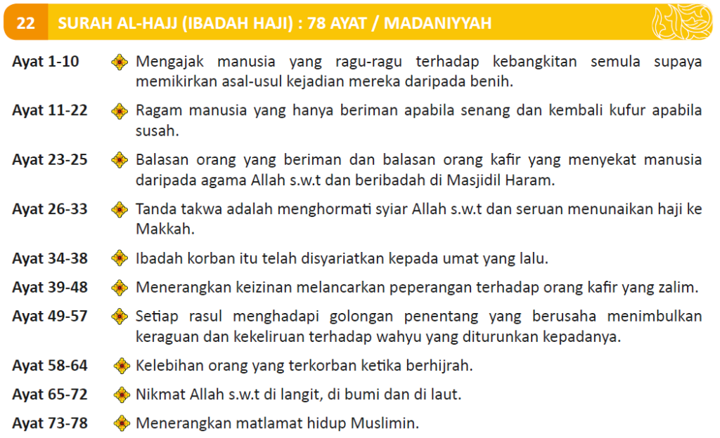 5. Wahai umat manusia, sekiranya kamu menaruh syak (ragu-ragu) tentang kebangkitan makhluk (hidup semula pada hari kiamat), maka (perhatilah kepada peringkat kejadian) kerana sebenarnya Kami telah menciptakan kamu daripada tanah, kemudian daripada setitik air benih (mani), kemudian daripada seketul darah beku, kemudian daripada seketul daging yang disempurnakan kejadiannya dan yang tidak disempurnakan. (Kami jadikan secara yang demikian) kerana Kami hendak menerangkan kepada kamu (kekuasaan Kami). Kami juga menetapkan di dalam kandungan rahim (ibu yang mengandung itu) apa yang Kami rancang hingga ke suatu masa yang ditentukan lahirnya, kemudian Kami mengeluarkan kamu berupa kanak-kanak, kemudian (kamu dipelihara) hingga sampai ke peringkat umur dewasa. (Dalam pada itu) ada antara kamu yang dimatikan (semasa kecil atau semasa dewasa) dan ada pula yang dilanjutkan umurnya ke peringkat tua nyanyuk sehingga dia tidak mengetahui lagi akan sesuatu yang telah diketahuinya dahulu. Dan (ingatlah satu bukti lagi), engkau melihat bumi itu kering, kemudian apabila Kami menurunkan hujan menimpanya, berubahlah tanahnya (dengan tumbuh-tumbuhan), subur, serta ia menumbuhkan berjenis-jenis tanaman yang indah.