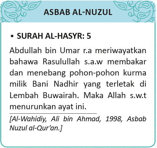 5. Apa-apa jua pohon tamar (kepunyaan musuh) yang kamu tebang atau kamu biarkan tegak berdiri seperti keadaannya yang asal, maka yang demikian adalah dengan izin Allah dan kerana Dia hendak menimpakan kehinaan kepada orang yang fasik.