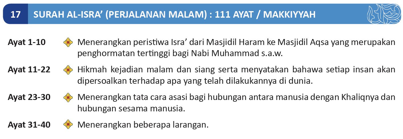 1. Maha Suci Allah yang telah menjalankan hamba-Nya (Nabi Muhammad) pada malam hari dari Masjidil Haram (di Makkah) ke Masjidil Aqsa (di Palestin) yang Kami berkati sekelilingnya, untuk memperlihatkan kepadanya tanda-tanda (kekuasaan dan kebesaran) Kami. Sesungguhnya Dia (Allah) jualah yang Maha Mendengar lagi Maha Melihat.