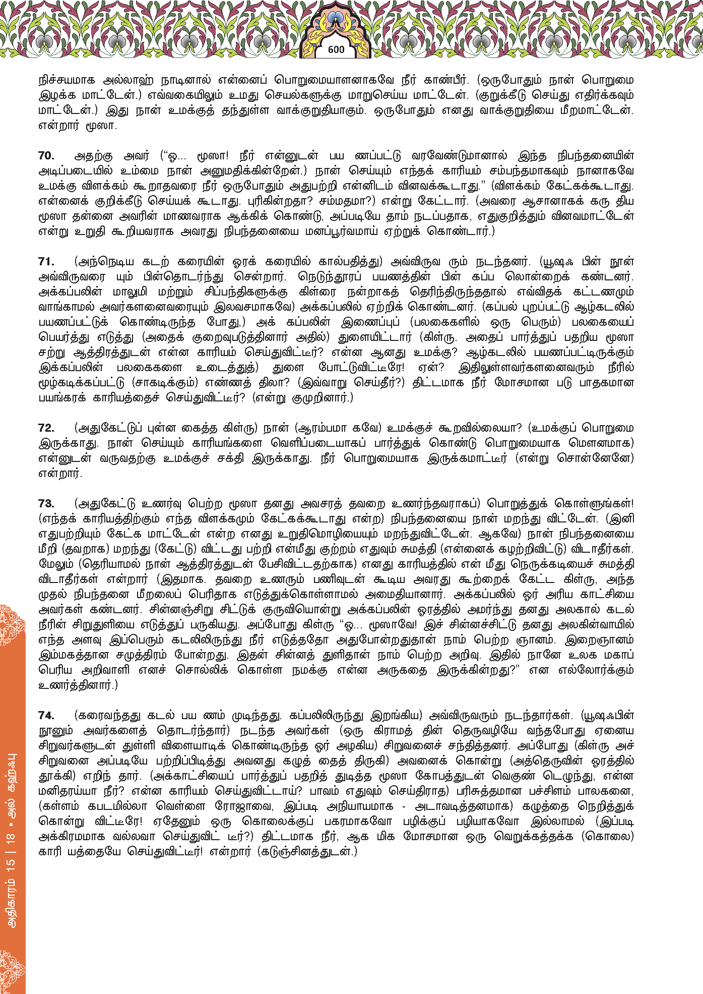 71. Lalu kedua-duanya berjalan sehingga apabila mereka naik ke sebuah perahu, dia (Nabi Khidir) membocorkannya. (Nabi Musa) berkata, “Patutkah engkau membocorkannya, sedangkan (akibat perbuatan itu) boleh menenggelamkan penumpang-penumpangnya? Sesungguhnya engkau telah melakukan satu kesalahan yang berat.”