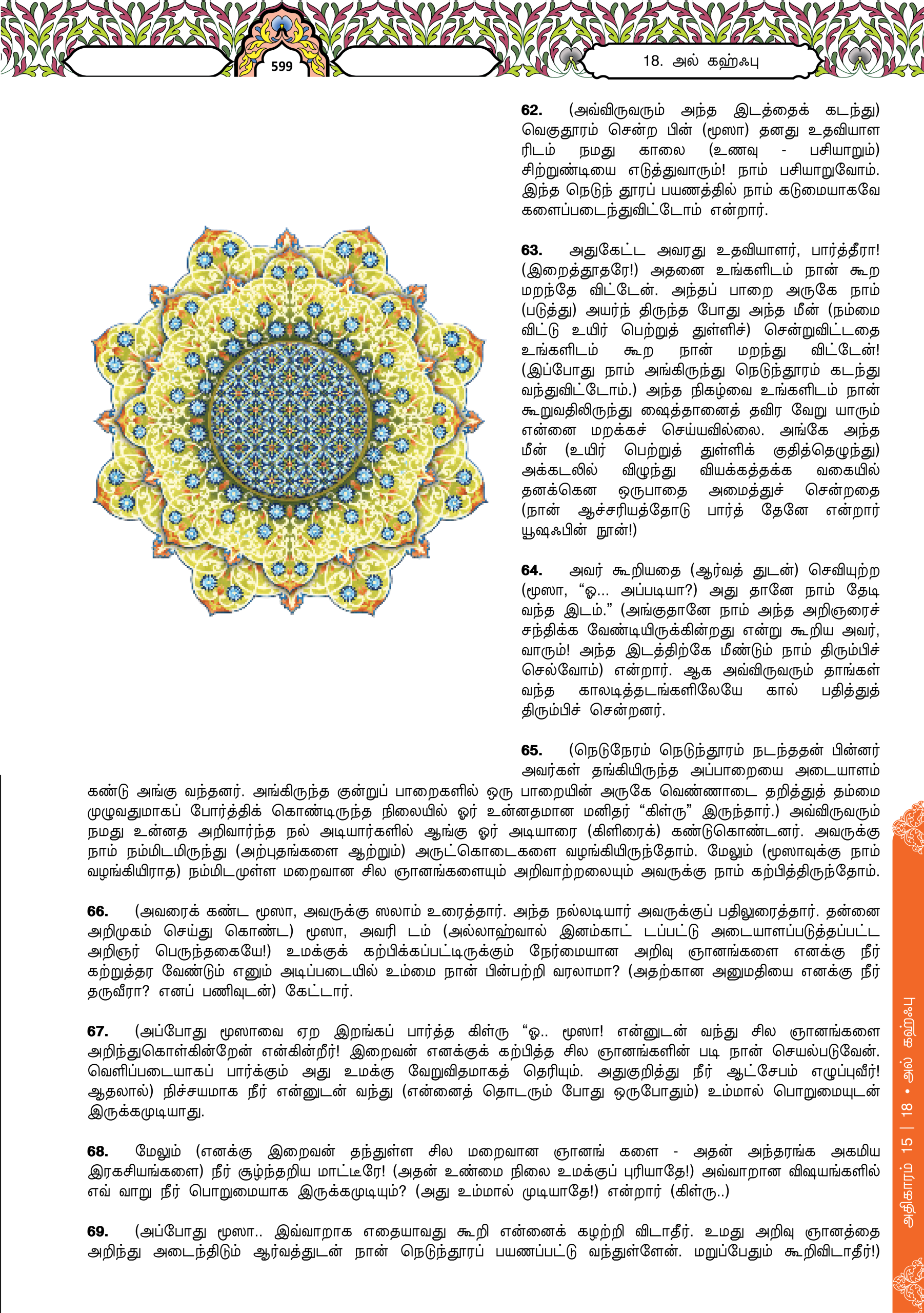 63. (Pembantunya) berkata, “Tahukah apa yang telah terjadi ketika kita berehat di batu besar itu? Sebenarnya aku lupakan hal ikan itu. Tiadalah yang membantu aku lupa daripada menyebutkan halnya kepada engkau melainkan syaitan. Ikan itu telah menggelongsor keluar menempuh jalannya ke laut dengan cara yang aneh.”