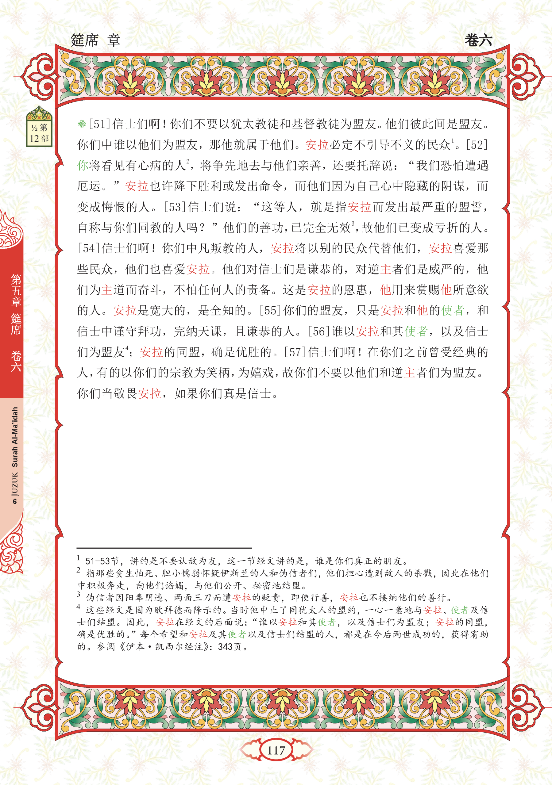 51. Wahai orang yang beriman! Janganlah kamu mengambil orang Yahudi dan Nasrani itu sebagai pemimpin-pemimpin kamu, kerana sebahagian mereka menjadi pemimpin kepada sebahagian yang lain. Dan sesiapa antara kamu yang menjadikan mereka pemimpinnya, maka sesungguhnya dia adalah daripada golongan mereka itu. Sesungguhnya Allah tidak memberi petunjuk kepada kaum yang zalim.