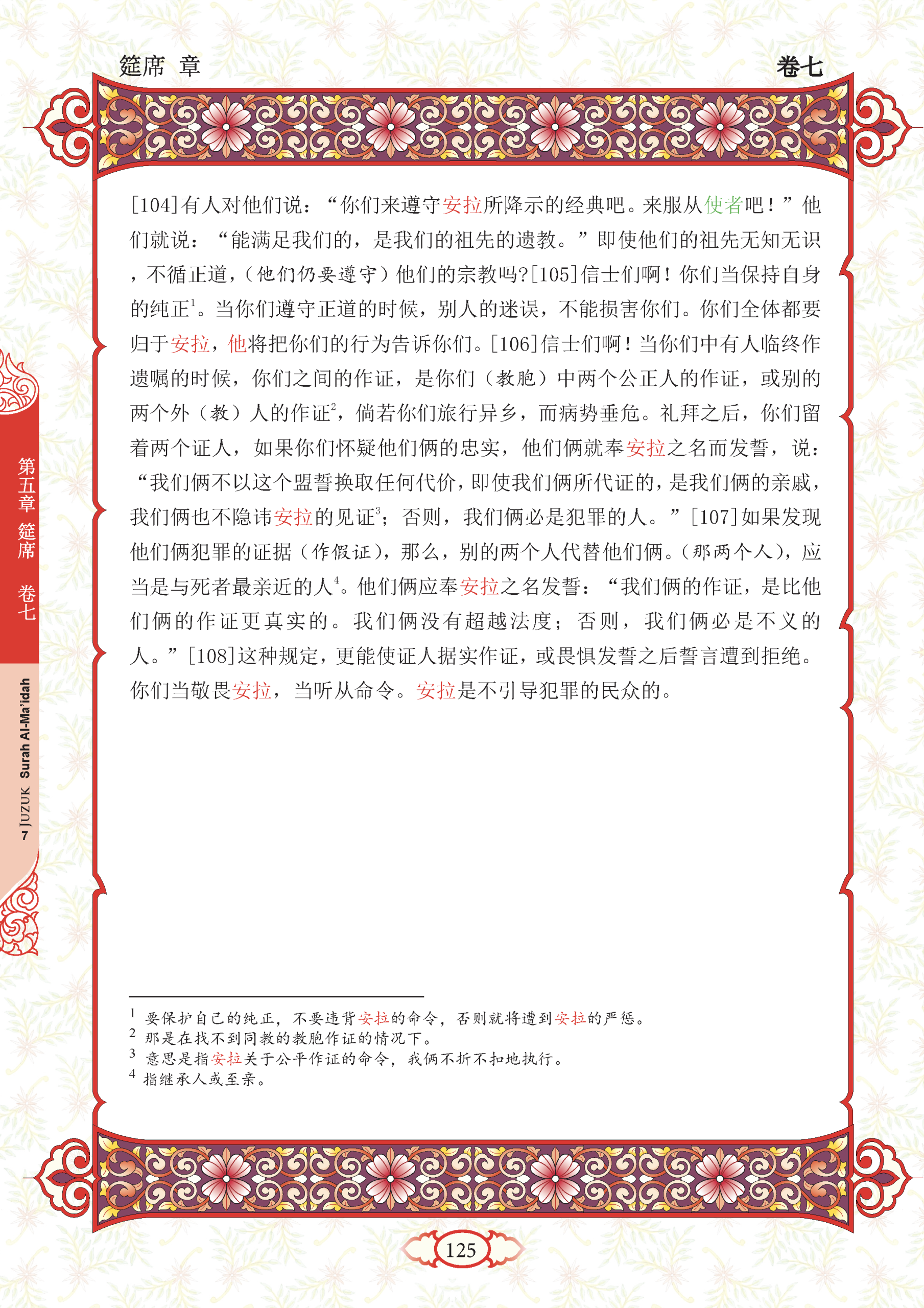 106. Wahai orang yang beriman! Apabila salah seorang antara kamu hampir mati, ketika (dia mahu) berwasiat, hendaklah wasiatnya itu disaksikan oleh dua orang yang adil antara kamu, atau dua orang lain (yang bukan seagama) dengan kamu (sewaktu ketiadaan orang Islam lain menjadi saksi), jika kamu dalam perjalanan di muka bumi, lalu kamu ditimpa bencana (sakit) yang membawa maut. (Kalau kamu meragui kejujuran kedua saksi itu, hendaklah) kamu tahan mereka sesudah selesai solat, kemudian mereka disuruh bersumpah dengan nama Allah (dengan berkata, “Demi Allah) kami tidak akan menjual sumpah kami dengan harga yang sedikit (untuk mendapat sesuatu yang berbentuk duniawi) walaupun orang itu daripada kaum kerabat, dan kami tidak menyembunyikan (keterangan yang kami ketahui) sebagai saksi (sebagaimana yang diperintahkan oleh) Allah. (Kerana jika kami menyembunyikannya) tentulah kami dengan itu termasuk dalam golongan orang yang berdosa.”
