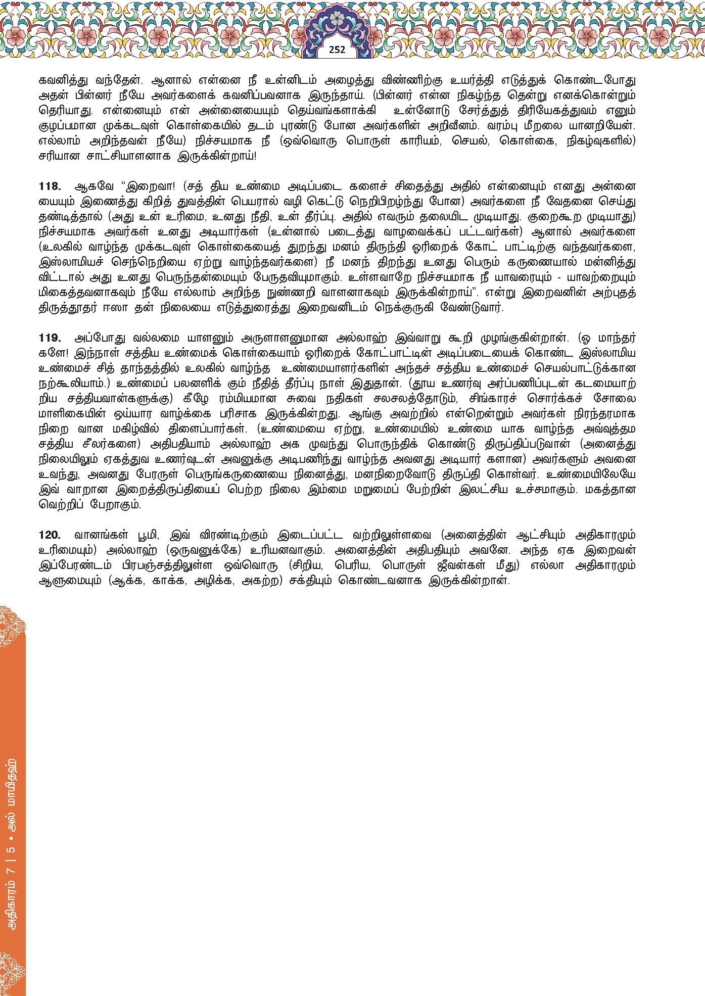 119. Allah berfirman, “Inilah hari (kiamat) yang (padanya) orang yang benar (pada tutur kata dan amal perbuatan) mendapat manfaat daripada kebenaran mereka. Mereka beroleh syurga-syurga yang mengalir di bawahnya beberapa sungai. Mereka kekal di dalamnya selama-lamanya. Allah reda terhadap mereka dan mereka pula redha terhadap-Nya. Itulah kejayaan yang amat besar.”