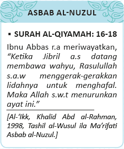 16. Janganlah engkau (wahai Muhammad) menggerakkan lidahmu membacanya (sebelum selesai dibacakan kepadamu) kerana hendak cepat (menghafal al-Quran yang diturunkan kepadamu).