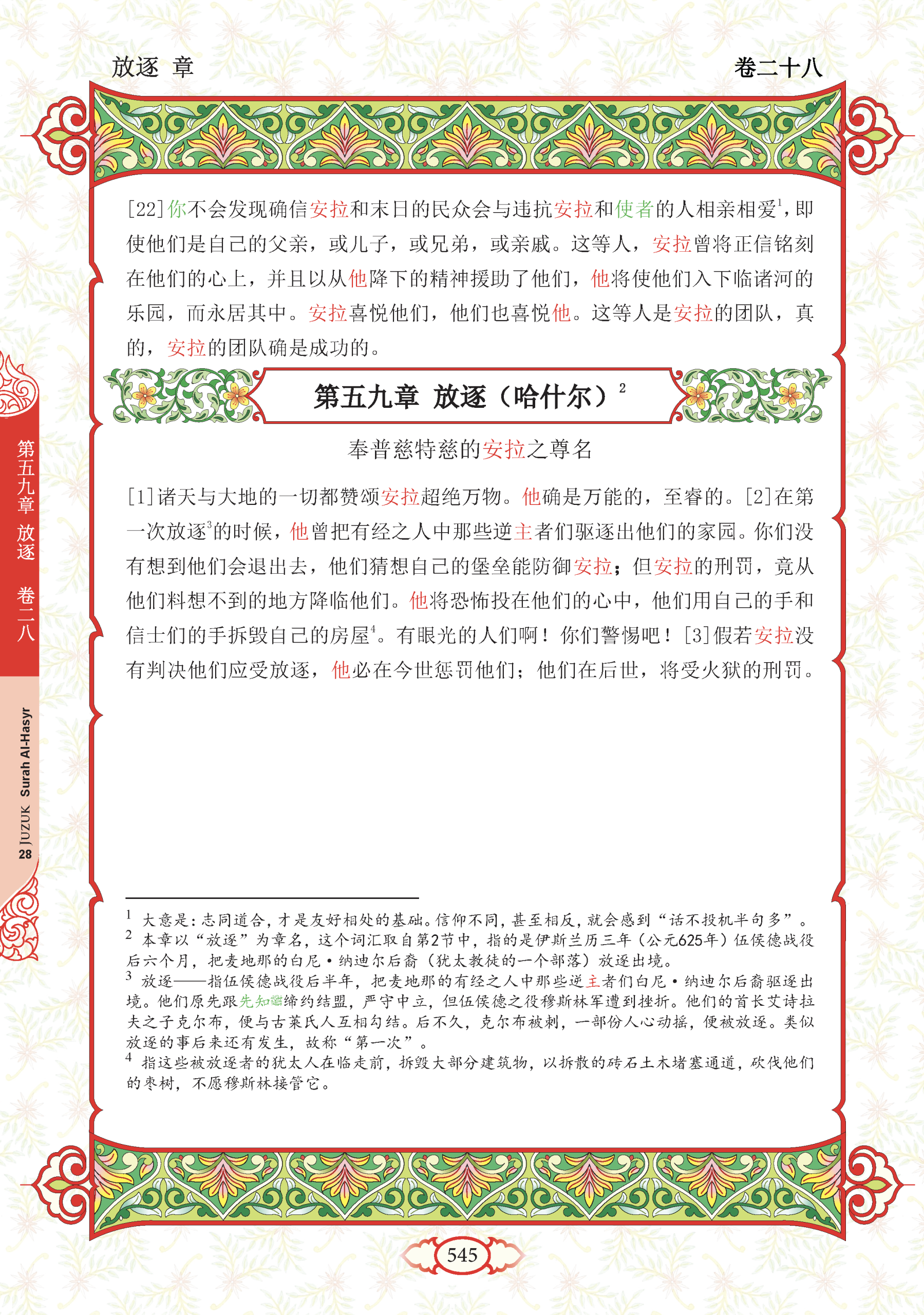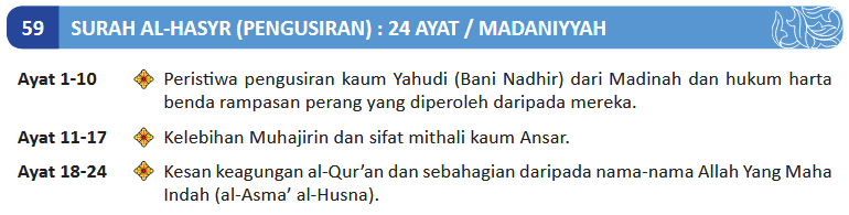 2. Dia-lah yang telah mengeluarkan orang kafir dalam kalangan Ahli Kitab dari kampung halaman mereka pada saat pengusiran yang pertama (kerana memerangi Rasulullah). Kamu (wahai umat Islam) tidak menyangka bahawa mereka akan keluar (disebabkan bilangannya yang ramai dan pertahanannya yang kuat), dan mereka pula menyangka bahawa benteng-benteng mereka akan dapat menahan serta memberi perlindungan kepada mereka daripada (azab) Allah. Maka Allah menimpakan (azab-Nya) kepada mereka dari arah yang tidak terlintas dalam fikiran mereka dan mencampakkan rasa takut ke dalam hati mereka, (lalu) mereka memusnahkan rumah-rumah mereka dengan tangan mereka sendiri (dari dalam) sambil tangan orang yang beriman (yang mengepung mereka berbuat demikian dari luar). Maka ambillah pengajaran (daripada peristiwa itu) wahai orang yang berakal fikiran (serta celik mata hatinya).