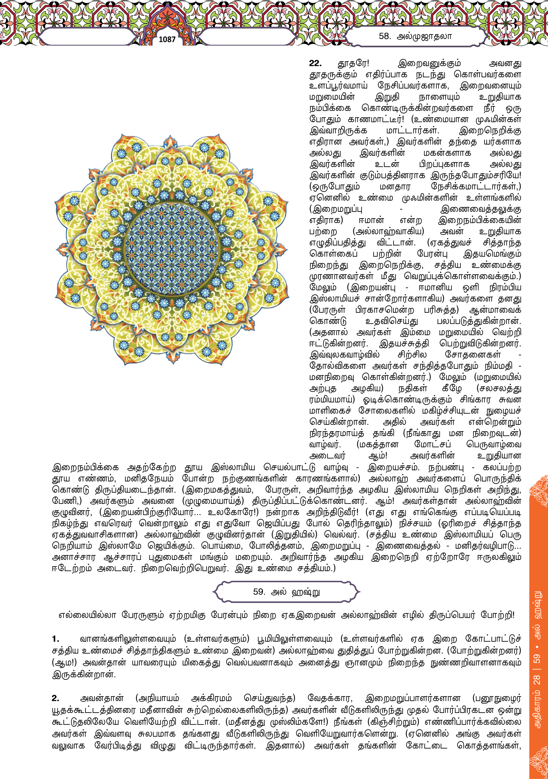 22. Engkau tidak akan mendapati sesuatu kaum yang beriman kepada Allah dan hari akhirat, tergamak berkasih sayang dengan orang yang menentang Allah dan rasul-Nya, sekalipun orang yang menentang itu ialah bapa-bapa atau anak-anak atau saudara-saudara ataupun keluarga mereka. Mereka itulah yang ditetapkan iman dalam hati mereka oleh Allah dan telah menguatkan mereka dengan pertolongan daripada-Nya, serta Dia akan memasukkan mereka ke dalam syurga yang mengalir di bawahnya beberapa sungai, mereka tetap kekal di dalamnya. Allah reda akan mereka dan mereka reda (serta bersyukur) terhadap-Nya. Merekalah golongan Allah (para pendukung agama-Nya). Ketahuilah! Sesungguhnya golongan Allah itu adalah orang yang berjaya.
