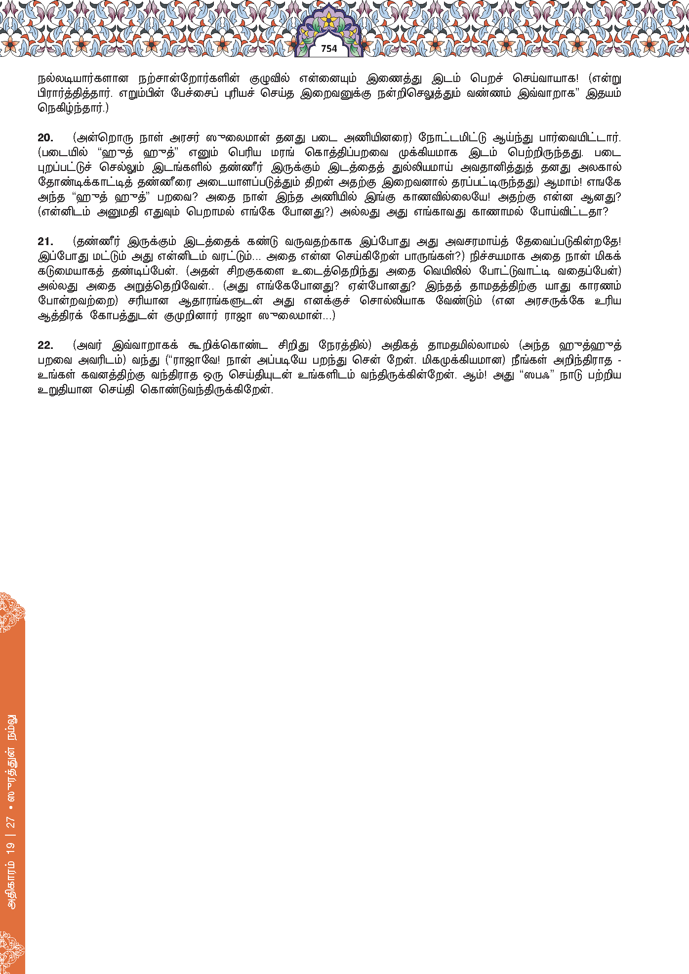 20. Dan (setelah itu) Sulaiman memeriksa kumpulan burung (yang turut serta dalam tenteranya) lalu berkata, “Mengapa aku tidak melihat burung Hudhud (belatuk)? Adakah ia daripada mereka yang tidak hadir?”