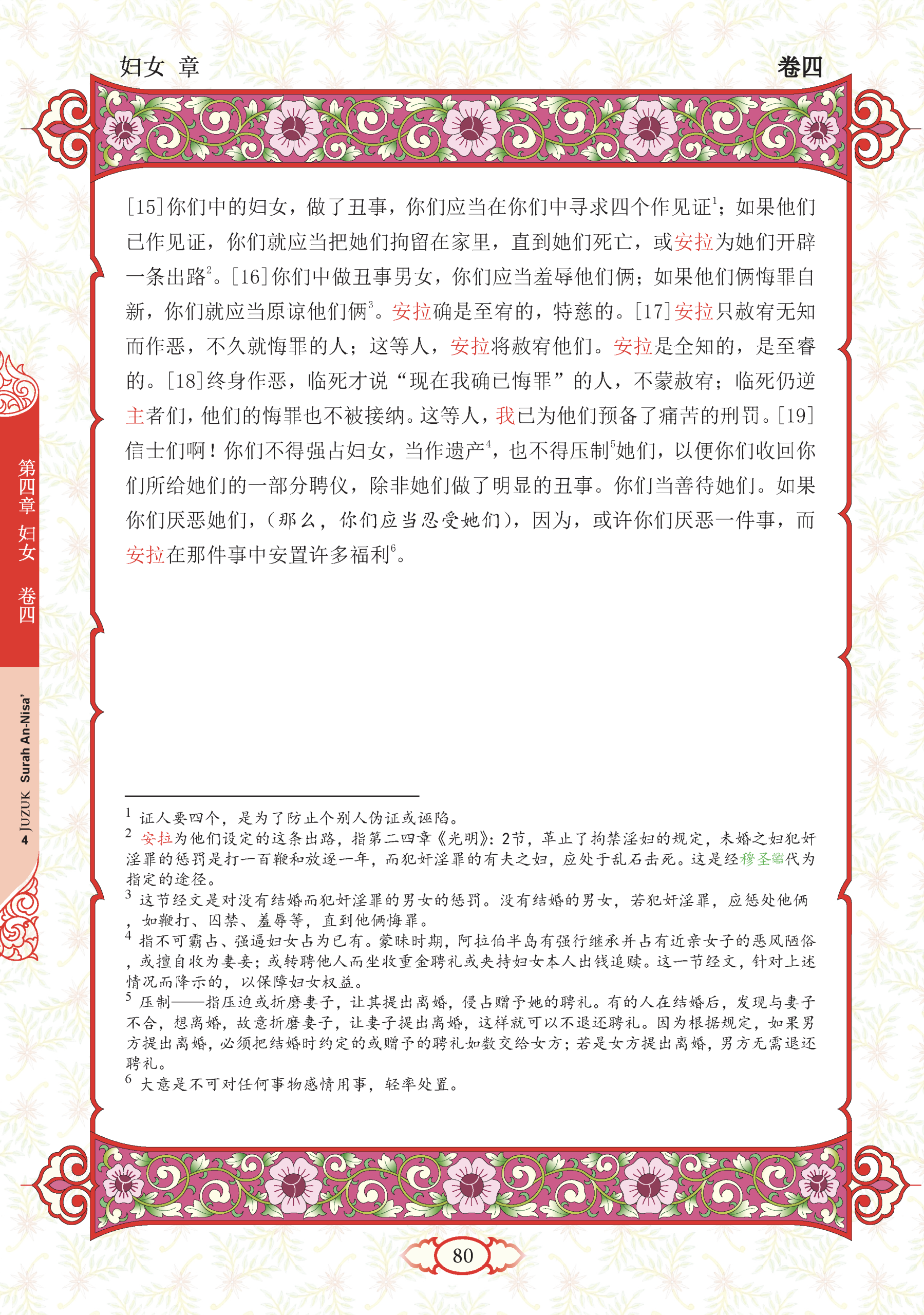 15. Dan antara wanita-wanita kamu yang mengerjakan perbuatan keji (zina), maka carilah empat orang lelaki antara kamu yang menjadi saksi terhadap perbuatan mereka. Kemudian kalau keterangan-keterangan saksi itu mengesahkan perbuatan tersebut, maka kurunglah mereka (perempuan yang berzina itu) dalam rumah hingga sampai ajalnya, atau hingga Allah mengadakan untuk mereka jalan keluar (daripada hukuman itu).