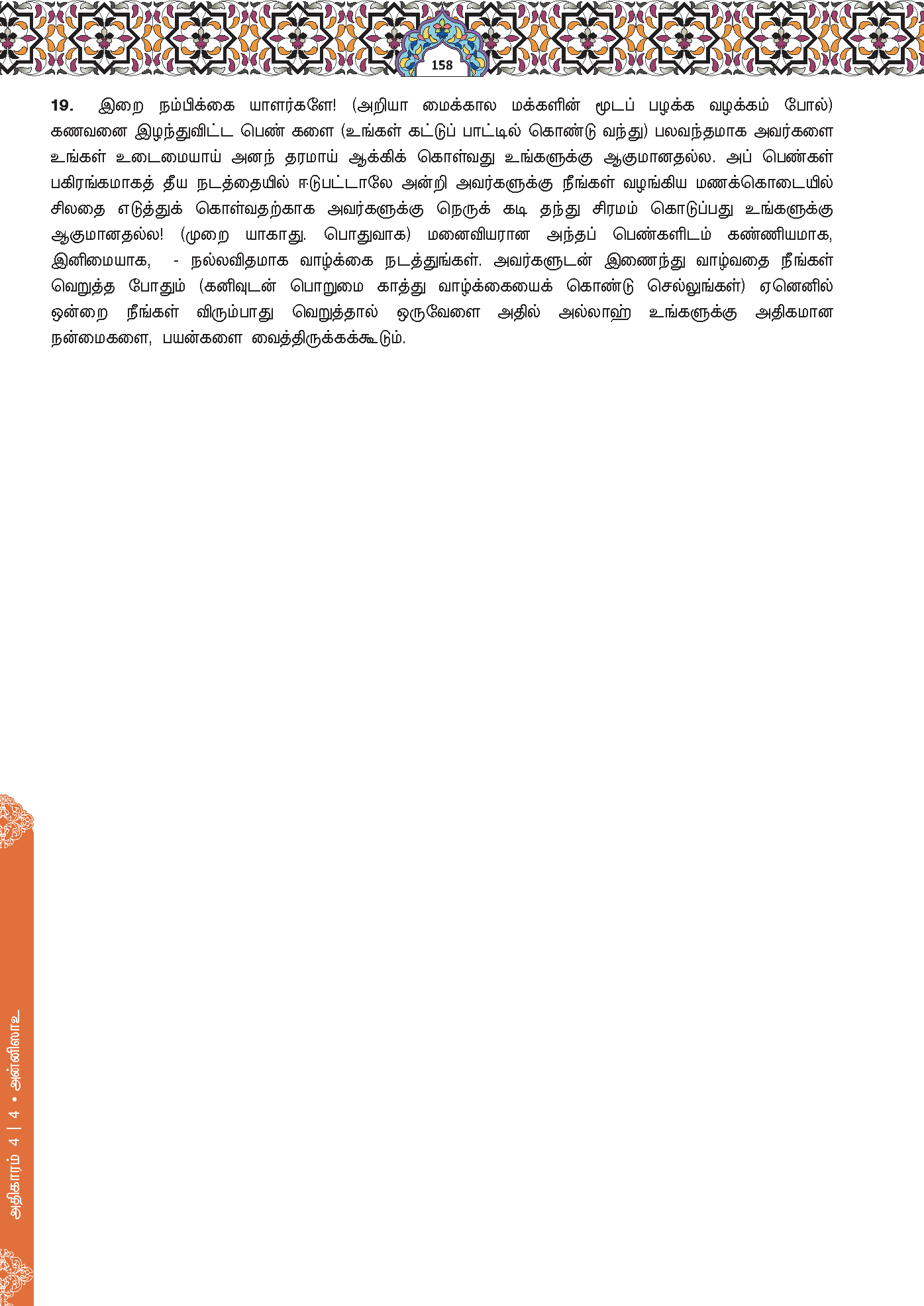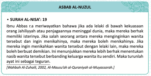 19. Wahai orang yang beriman, tidak halal bagi kamu mewarisi diri wanita dengan jalan paksaan dan janganlah kamu menyakiti mereka (dengan menahan dan menyusahkan mereka) kerana kamu hendak mengambil balik sebahagian daripada apa yang kamu telah berikan kepada mereka, kecuali (apabila) mereka melakukan perbuatan keji yang nyata. Dan bergaullah kamu dengan mereka (isteri-isteri kamu itu) dengan cara yang baik. Kemudian jika kamu (merasai) benci kepada mereka (disebabkan tingkah-lakunya, janganlah kamu terburu-buru menceraikannya) kerana boleh jadi kamu bencikan sesuatu, sedang Allah hendak menjadikan pada apa yang kamu benci itu kebaikan yang banyak (untuk kamu).