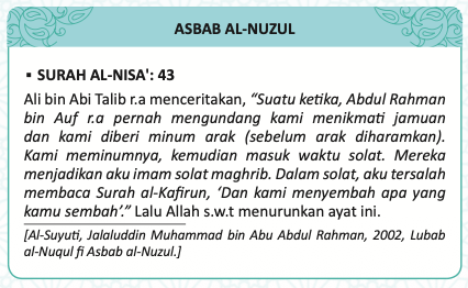 43. Wahai orang yang beriman, janganlah kamu menghampiri solat (mengerjakannya) sedangkan kamu dalam keadaan mabuk sehingga kamu mengerti akan apa yang kamu ucapkan dan janganlah pula (menghampiri masjid) sedangkan kamu dalam keadaan junub (berhadas besar) kecuali sekadar melintas sahaja sehinggalah kamu mandi (mengangkat hadas besar), dan jika kamu sakit atau sedang dalam musafir atau salah seorang antara kamu datang dari tempat buang air atau kamu bersentuh dengan perempuan, kemudian kamu tidak mendapat air (untuk mandi atau berwuduk), maka bertayamumlah dengan tanah (debu) yang suci, iaitu sapukanlah ke muka dan kedua-dua tangan kamu. Sesungguhnya Allah Maha Pemaaf lagi Maha Pengampun.