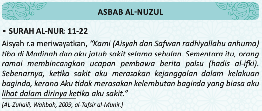 12. Mengapa semasa kamu mendengar tuduhan itu, orang yang beriman lelaki dan wanita, tidak bersangka baik terhadap sesama sendiri dan berkata, “Ini adalah tuduhan dusta yang nyata.”