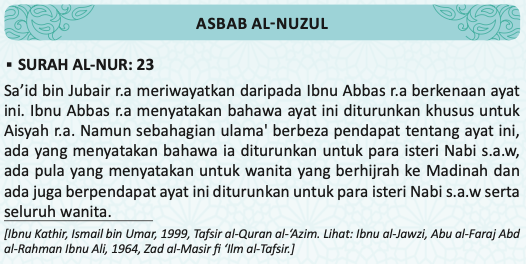 23. Sesungguhnya orang yang menuduh perempuan-perempuan yang terpelihara kehormatannya, yang tidak terlintas memikirkan sebarang kejahatan, lagi yang beriman, akan dilaknat di dunia dan di akhirat dan mereka pula akan beroleh azab yang besar.