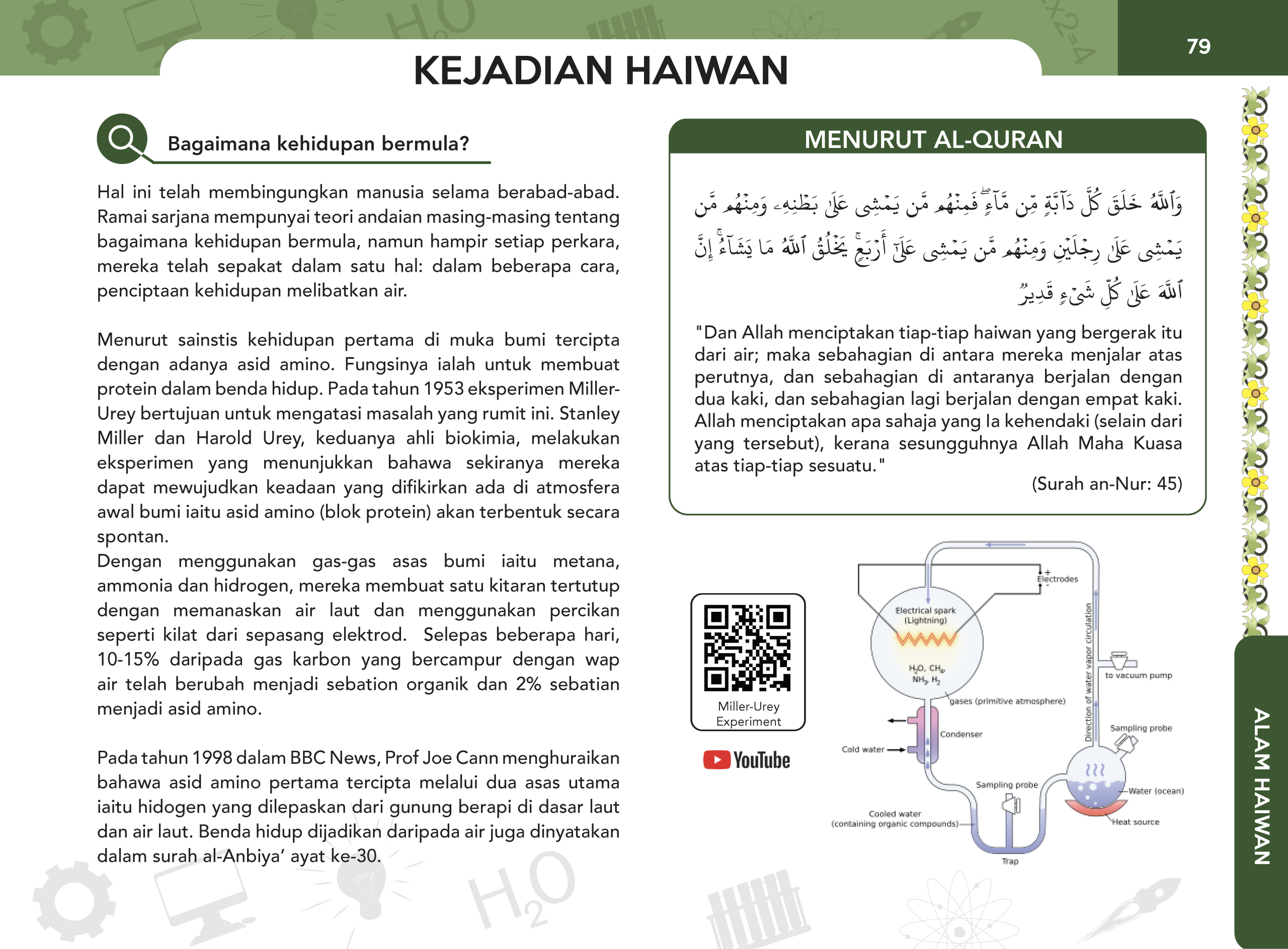 45. Dan Allah menciptakan setiap haiwan yang bergerak itu daripada air, maka sebahagian daripada haiwan itu ada yang menjalar di atas perutnya dan sebahagiannya berjalan dengan dua kaki dan sebahagian lagi berjalan dengan empat kaki. Allah menciptakan apa sahaja yang Dia kehendaki kerana sesungguhnya Allah Maha Berkuasa atas setiap sesuatu.