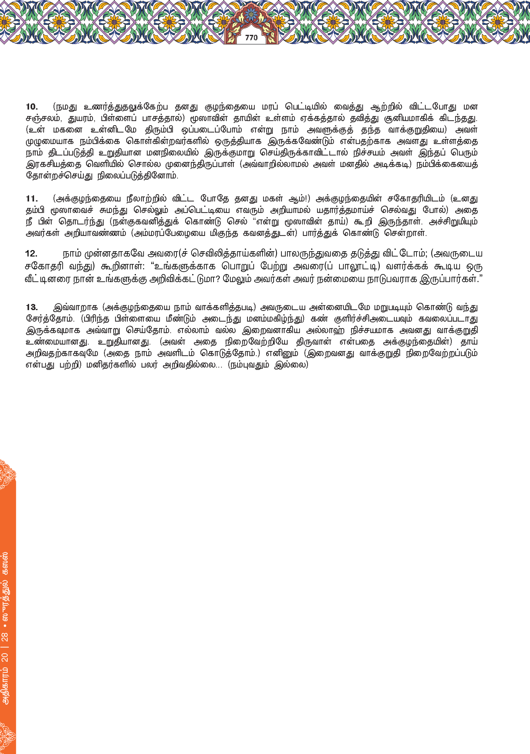 13. So We gave him back to his mother, that she might cheer her eyes, and that she might not grieve, and that she might know that the Promise of Allah is true, but most of them know not.