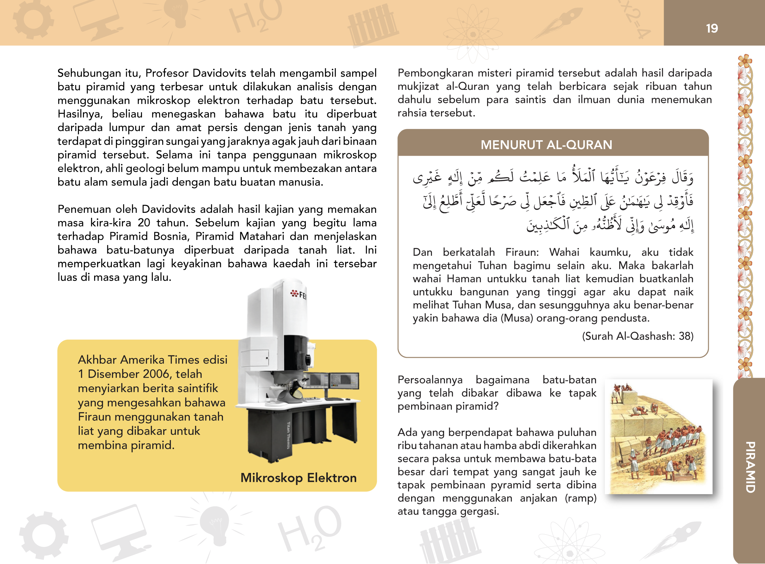 38. Dan Firaun pula berkata, “Wahai pembesar kaumku, aku tidak mengetahui ada bagi kamu sebarang tuhan yang lain daripadaku, oleh itu, wahai Haman, bakarkanlah untukku tanah liat (untuk membuat batu bata), serta binalah untukku bangunan yang tinggi, supaya aku naik melihat Tuhan Musa (yang dikatakannya itu). Sesungguhnya aku yakin Musa adalah orang yang berdusta.”