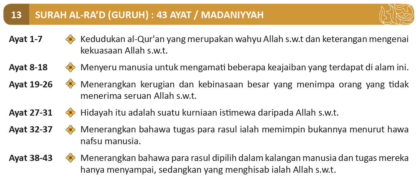 1. Alif, Lam, Mim, Ra’. Ini adalah ayat-ayat Kitab (al-Quran). Apa yang diturunkan kepadamu (wahai Muhammad) daripada Tuhanmu adalah benar, tetapi kebanyakan manusia tidak (mahu) beriman.