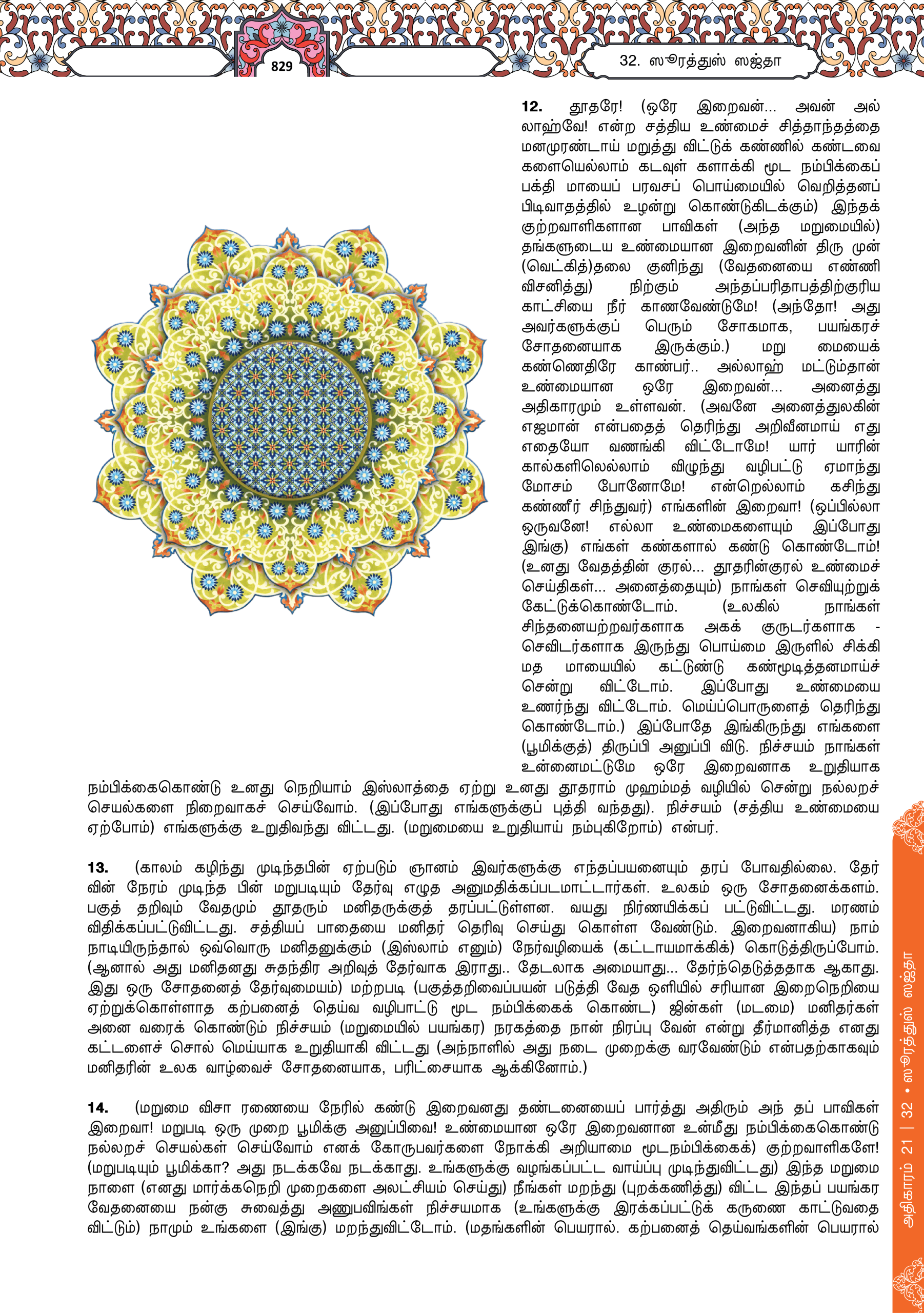 16. Mereka menjauhkan diri dari tempat tidur (mengurangkan tidur untuk mengerjakan solat tahajud dan amal soleh), mereka sentiasa berdoa kepada Tuhan mereka dengan perasaan takut dan perasaan mengharap (keredhaan-Nya) dan mereka selalu mendermakan sebahagian daripada rezeki yang Kami berikan kepada mereka.