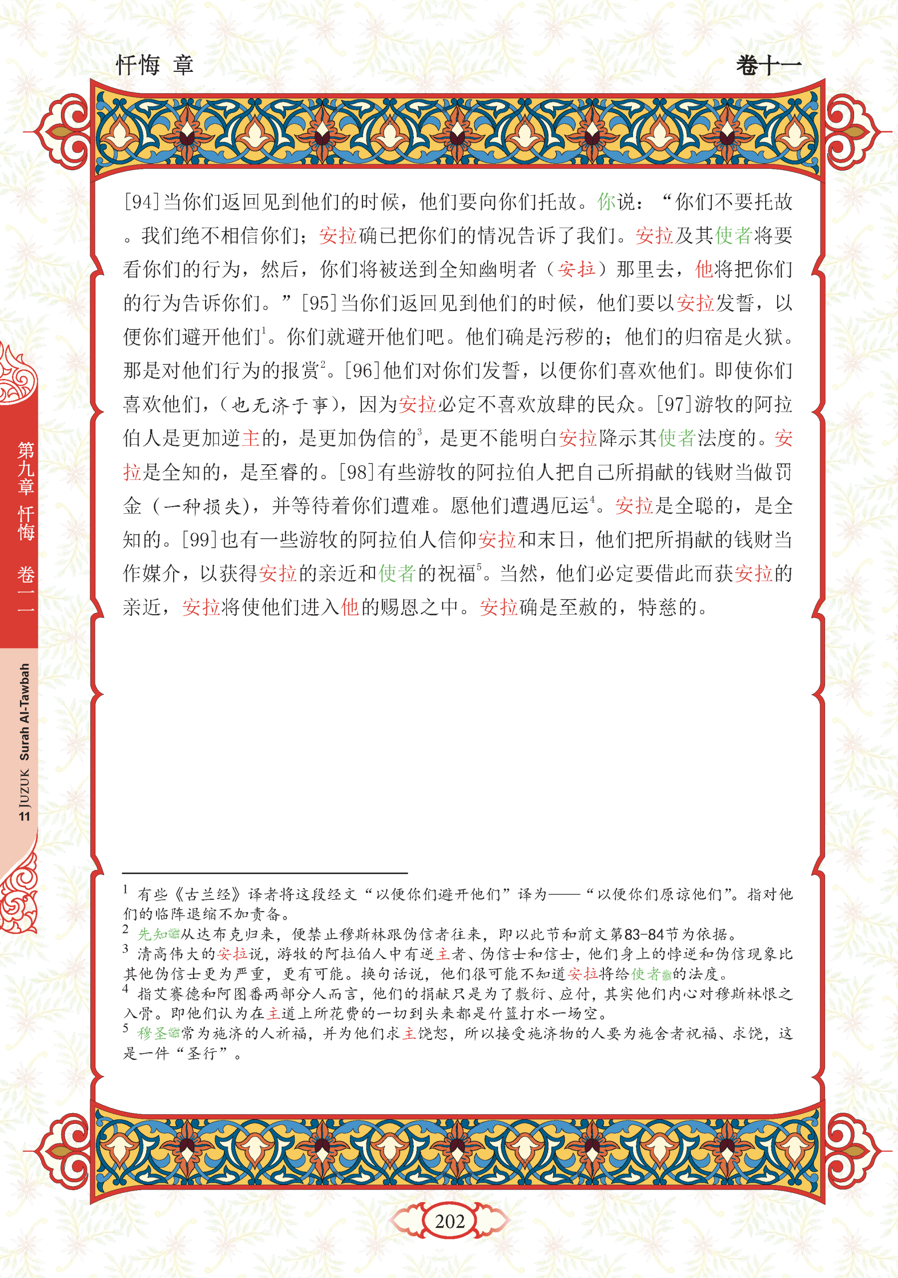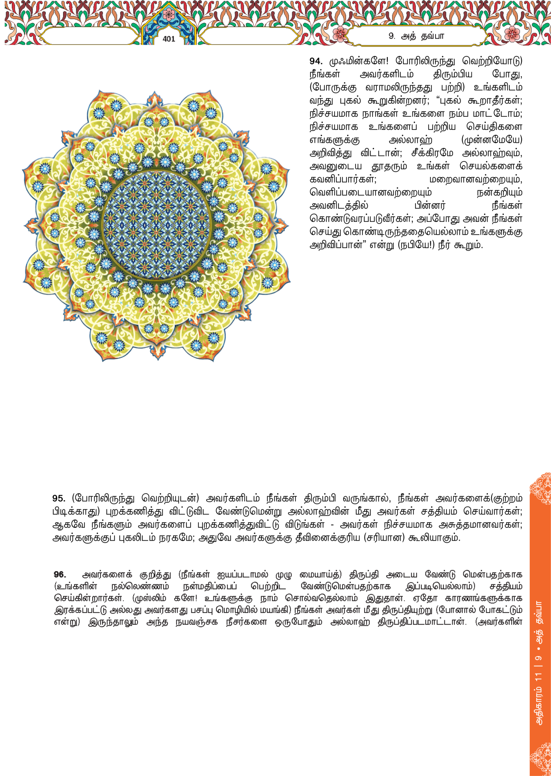 94. Mereka akan menyatakan keuzuran kepada kamu apabila kamu kembali kepada mereka (dari medan perang). Katakanlah (wahai Muhammad), “Janganlah kamu menyatakan keuzuran lagi, kami sekali-kali tidak akan percaya kepada kamu. (Kerana) sesungguhnya Allah telah menerangkan kepada kami akan berita-berita (perihal) kamu (yang sebenarnya). Allah dan rasul-Nya akan melihat amal kamu (sama ada kamu kembali beriman atau tetap kufur), kemudian kamu akan dikembalikan kepada (Allah) yang mengetahui perkara-perkara yang ghaib dan yang nyata (untuk menerima balasan), lalu Dia menyatakan kepada kamu apa yang kamu telah kerjakan.”