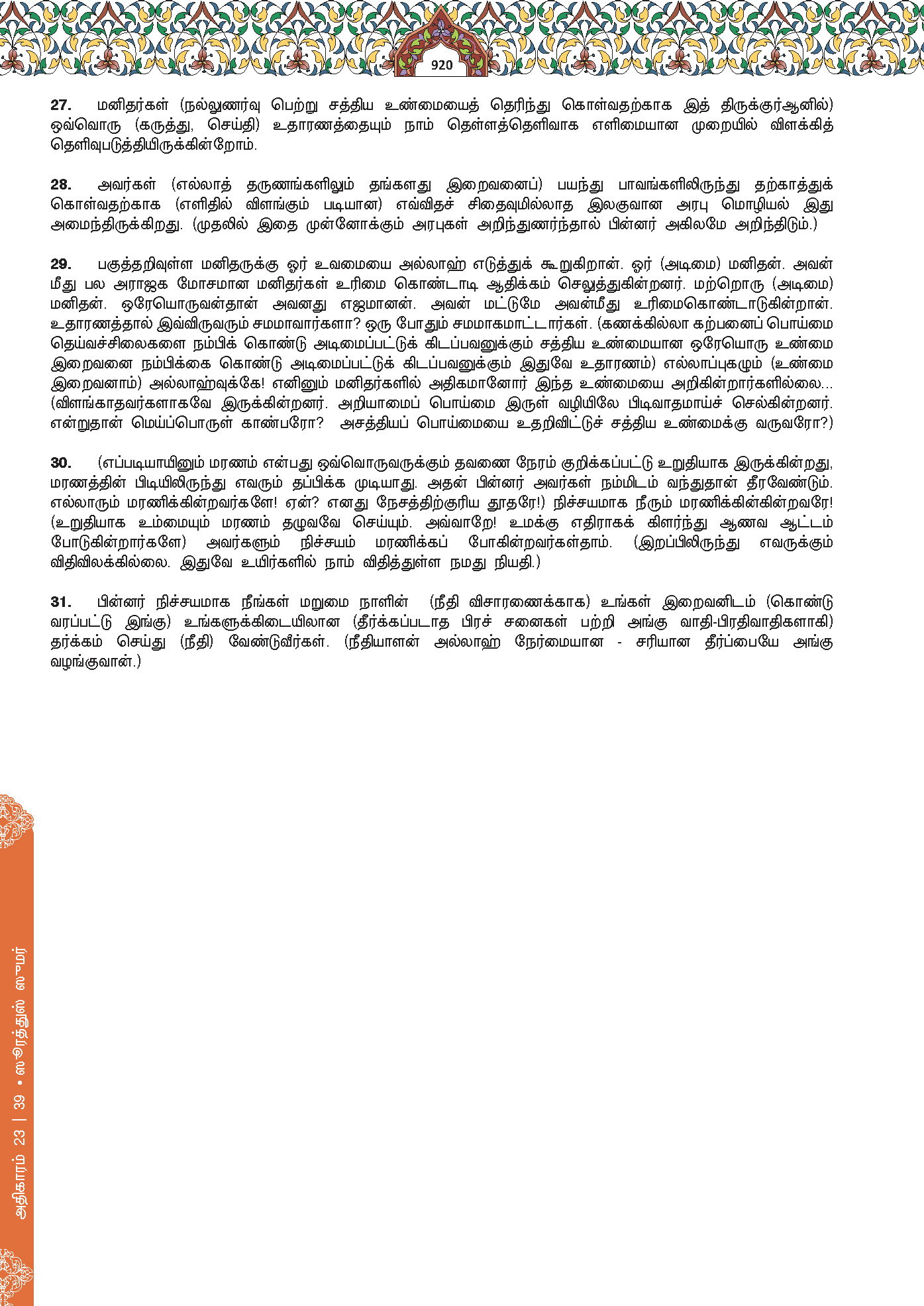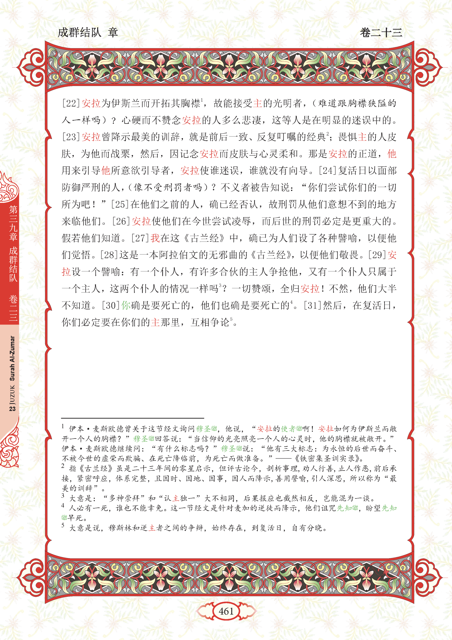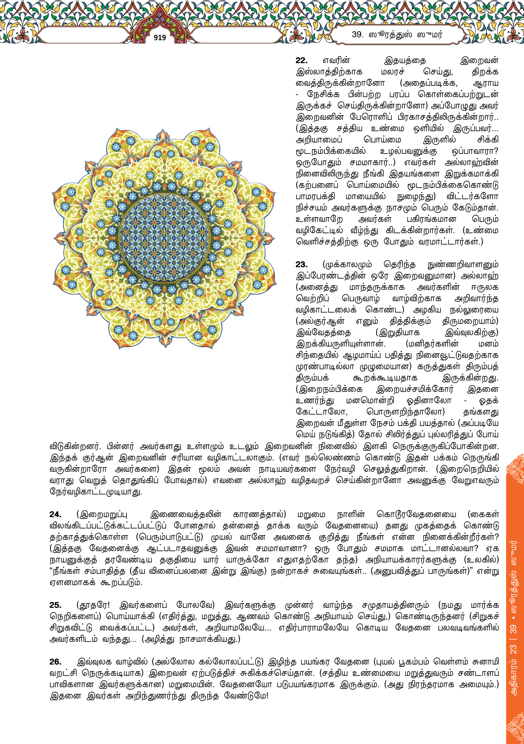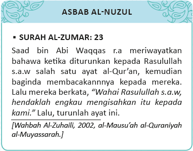 23. Allah telah menurunkan sebaik-baik perkataan iaitu Kitab Suci al-Quran yang sama (isi kandungannya antara satu dengan yang lain), yang berulang-ulang (keterangannya dengan pelbagai cara), yang menjadi gementar kulit badan orang yang takut kepada Tuhan mereka, kemudian kulit badan mereka menjadi lembut serta tenang hati mereka sewaktu ingat kepada Allah. Kitab Suci itulah hidayah Allah. Allah memberi hidayah melalui al-Quran itu kepada sesiapa yang dikehendaki-Nya. (Ingatlah) sesiapa yang disesatkan Allah (disebabkan pilihannya yang salah), maka tidak ada sesiapa pun yang dapat memberi hidayah kepadanya.