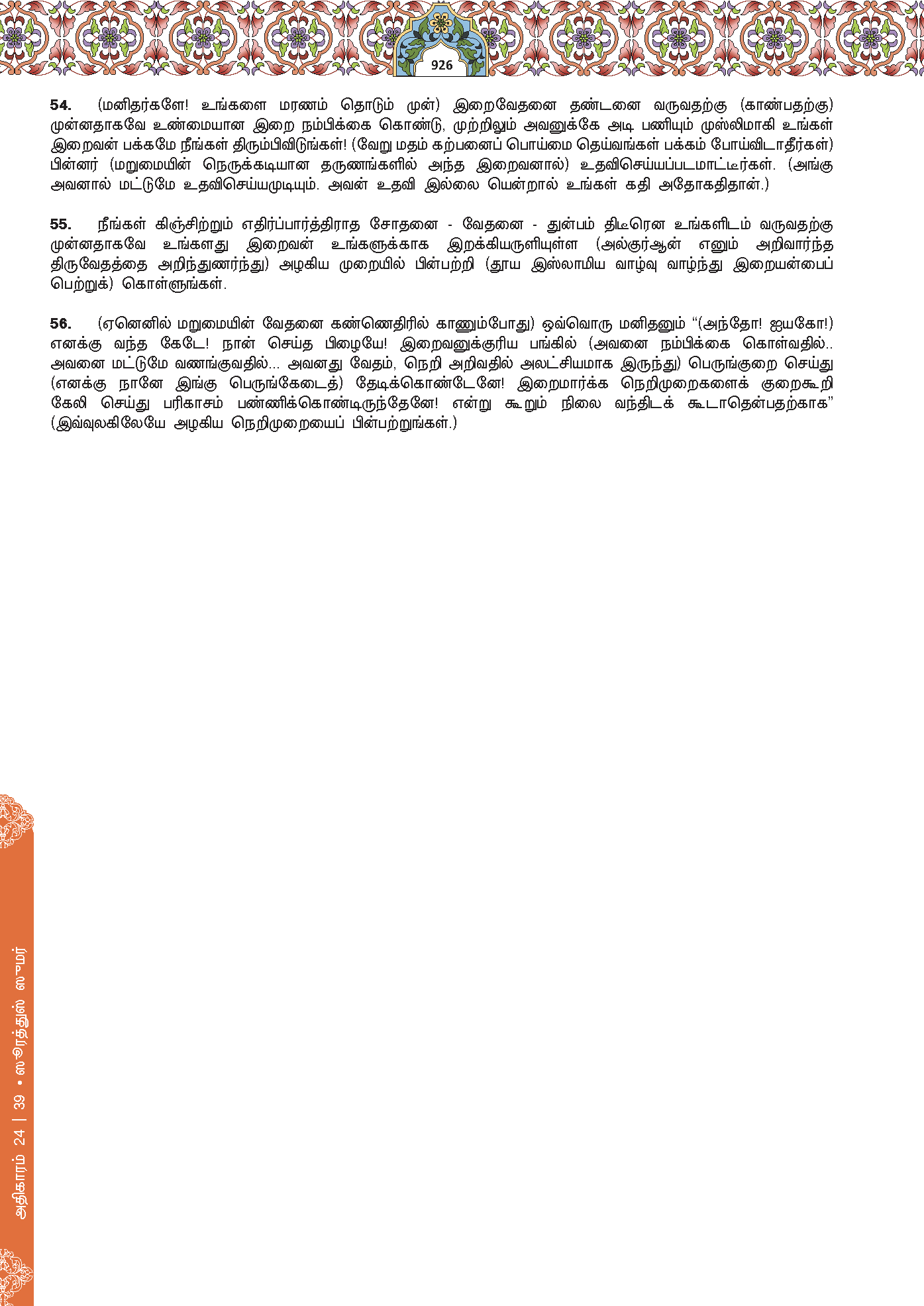 55. “Dan ikutilah sebaik-baik apa yang telah diturunkan kepada kamu daripada Tuhan kamu (iaitu al-Quran) sebelum kamu didatangi azab secara mengejut sedangkan kamu tidak menyedarinya.”