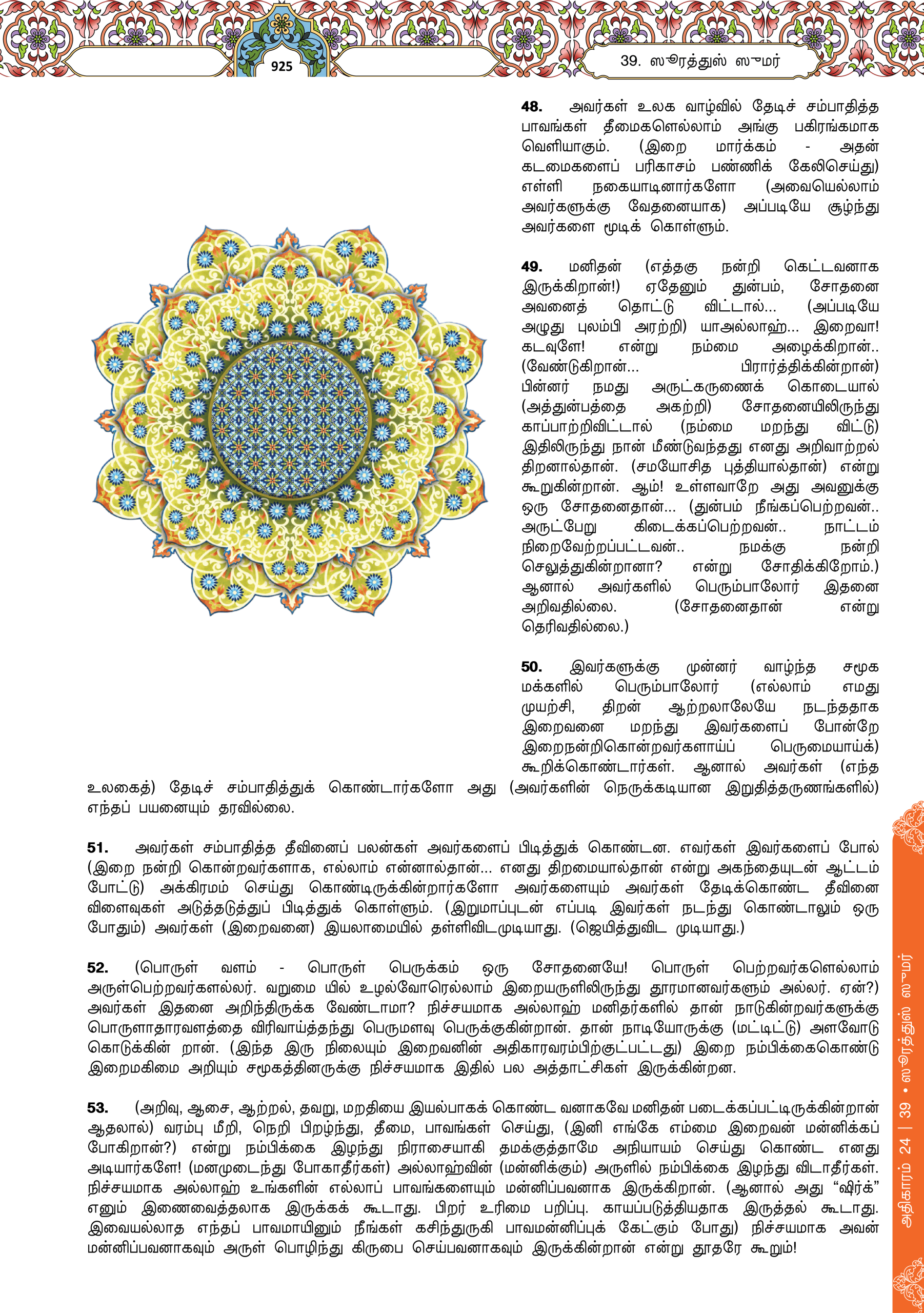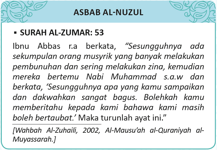 53. Katakanlah (wahai Muhammad), “Wahai hamba-hamba-Ku yang telah melampaui batas terhadap diri mereka sendiri (dengan perbuatan-perbuatan maksiat), janganlah kamu berputus asa daripada rahmat Allah. Sesungguhnya Allah mengampuni segala dosa. Sesungguhnya Dia-lah jua Yang Maha Pengampun lagi Maha Penyayang.”
