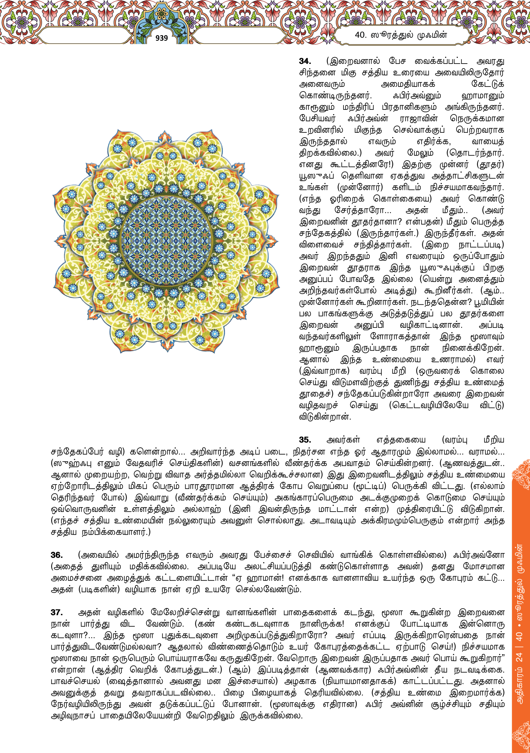 37. “(laitu) pintu-pintu langit supaya aku dapat melihat Tuhan Musa dan sesungguhnya aku menganggap Musa itu seorang pendusta.” Demikianlah dijadikan Firaun memandang baik (melalui hasutan syaitan) akan perbuatannya yang buruk itu serta dia dihalangi daripada jalan yang benar. Tipu daya Firaun itu tidak membawanya melainkan ke dalam kerugian dan kebinasaan.