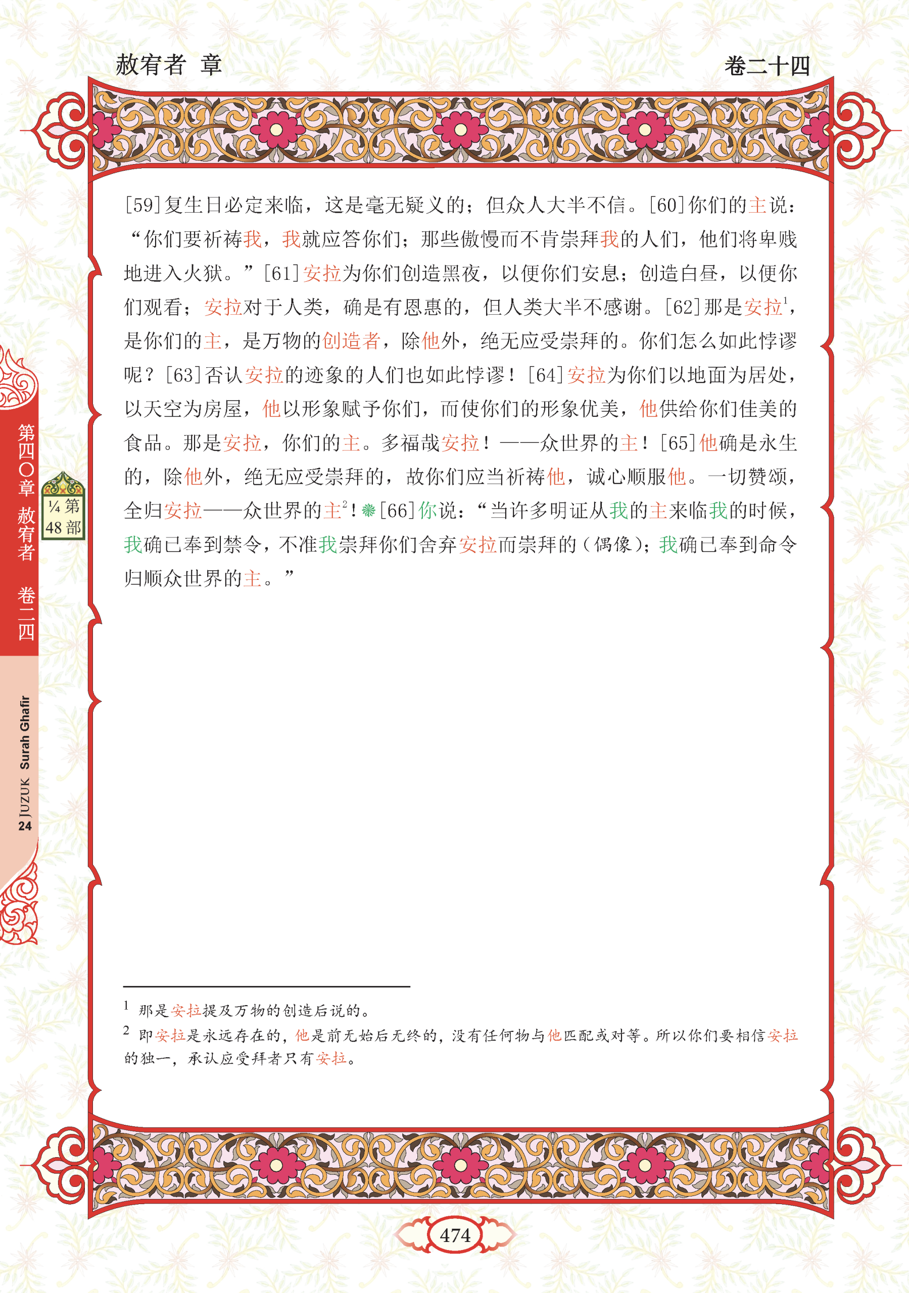 65. Dia-lah Yang Maha Hidup. Tiada Tuhan (yang berhak disembah) melainkan Dia. Maka hendaklah kamu menyembah-Nya dengan mengikhlaskan ibadah kamu kepada-Nya semata-mata. Segala puji bagi Allah Tuhan sekalian alam.