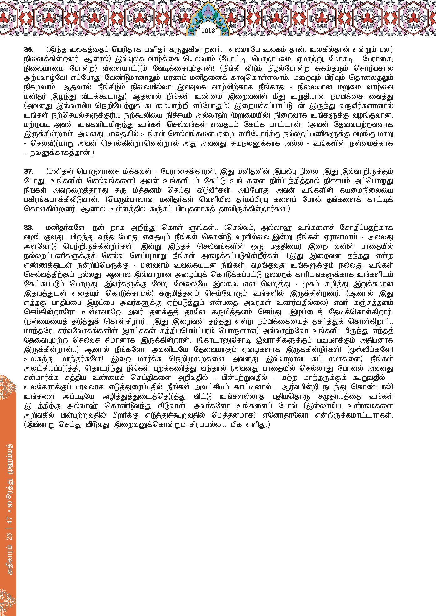 36. (Ingatlah) bahawa kehidupan dunia (yang tidak berlandaskan iman dan takwa) hanyalah ibarat permainan dan hiburan. Jika kamu beriman dan bertakwa, Allah akan memberikan pahala kepada kamu, dan Dia tidak sekali-kali meminta harta kamu.