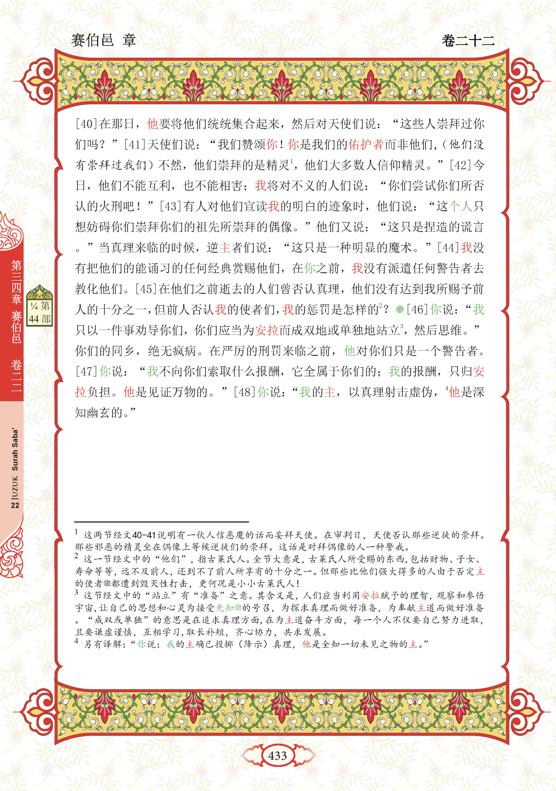 48. Katakanlah lagi, “Sesungguhnya Tuhanku menurunkan wahyu dengan kebenaran. Dia Maha Mengetahui akan segala perkara yang ghaib.”