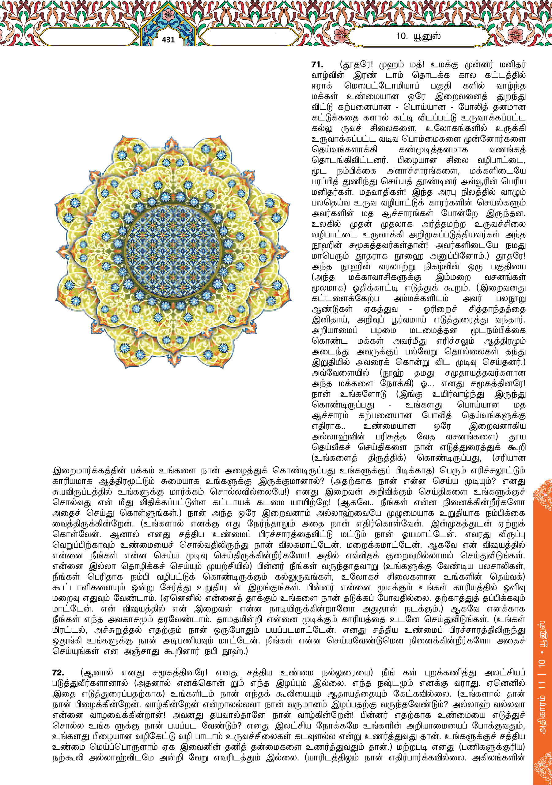 72. “Oleh itu, jika kamu berpaling (membelakangkan peringatanku, maka tidaklah menjadi masalah kepadaku), kerana aku tidak meminta sebarang balasan (upah) daripada kamu (dalam pelaksanaan tugasku itu). Balasanku hanyalah daripada Allah semata-mata dan aku hanya diperintahkan supaya menjadi daripada orang Islam (yang berserah diri kepada Allah).”