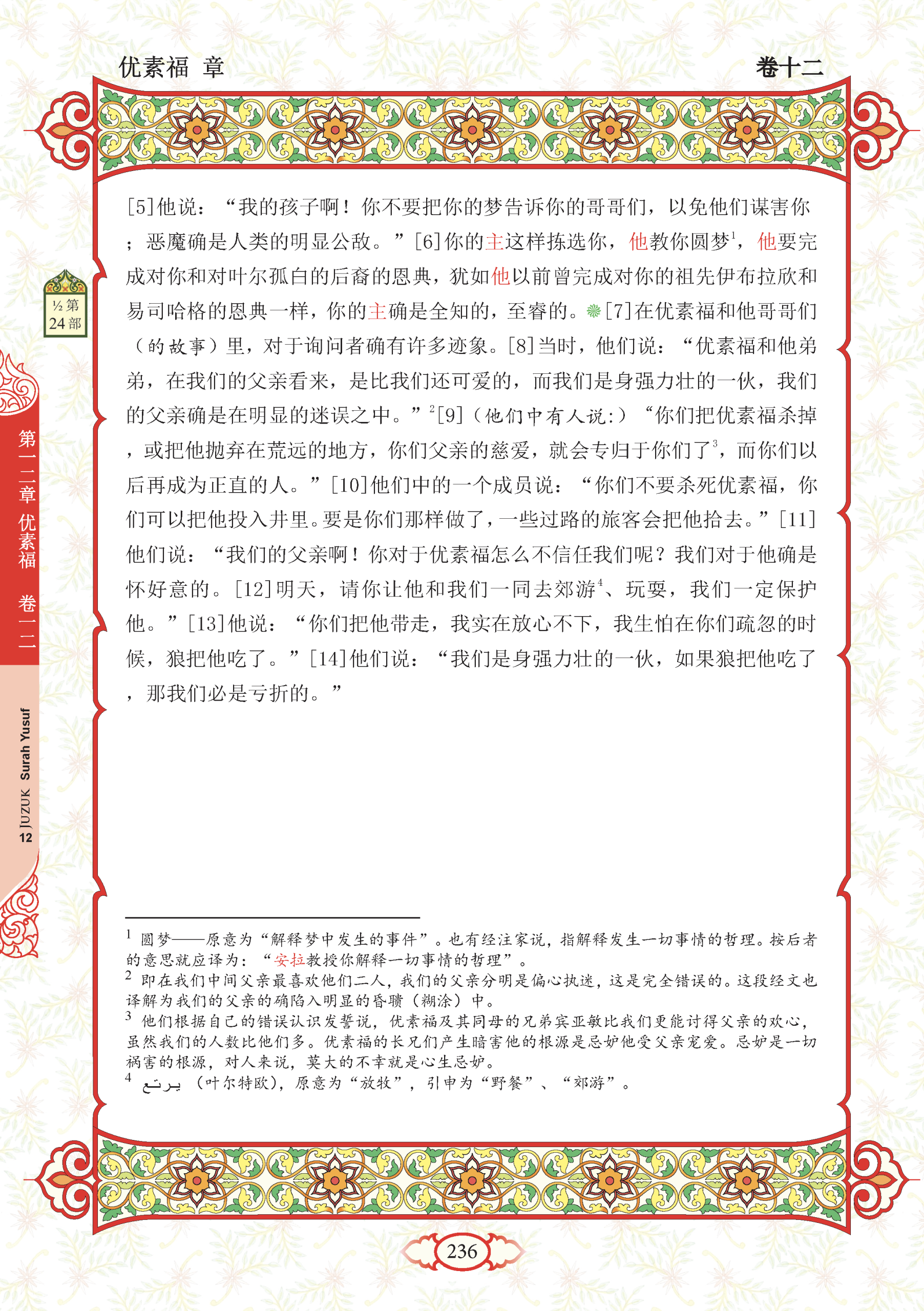 6. “Demikianlah (cara) Tuhanmu memilihmu dan mengajarkanmu ta’bir (mentafsir) mimpi serta menyempurnakan nikmat-Nya kepadamu dan kepada keluarga Yaakub, sebagaimana Dia telah menyempurnakannya kepada nenek moyangmu dahulu iaitu Ibrahim dan Ishak. Sesungguhnya Tuhanmu Maha Mengetahui lagi Maha Bijaksana.”